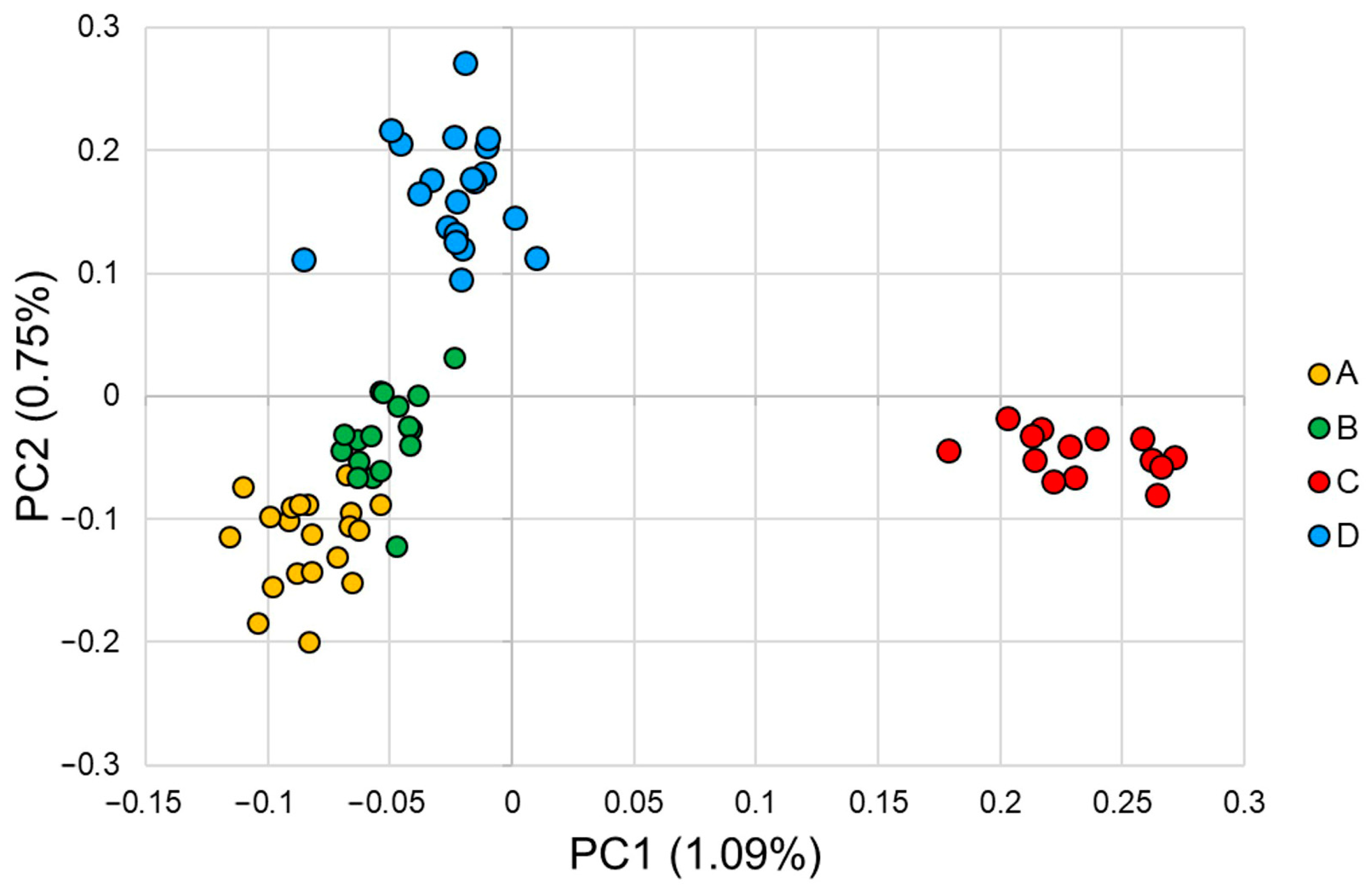 Figure 4. Principal component analysis (PCA) of whole-genome data for Taiwan commercial red-feathered country chickens. Samples are colored by farm (A: yellow, B: green, C: red, D: blue). The x axis represents the variance explained by PC1 (1.09%), and the y axis represents the variance explained by PC2 (0.75%).