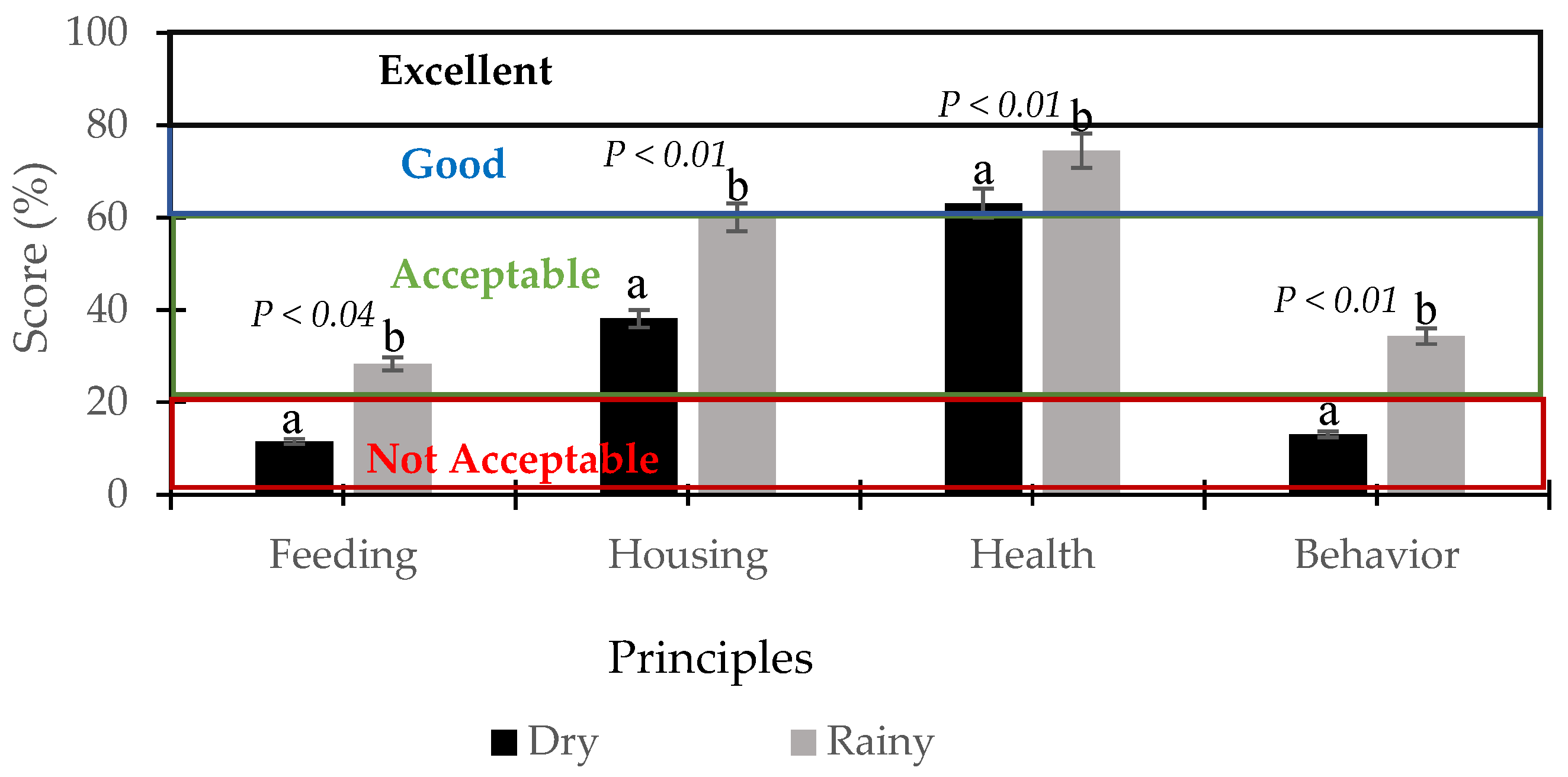 - Hernández, A.; Berg, C.; Eriksson, S.; Edstam, L.; Orihuela, A.; León, H.; Galina, C. The Welfare Quality assessment protocol: How can it be adapted to family farming dual purpose cattle raised under extensive systems in tropical conditions? Anim. Welf. 2017, 26, 177–184. [Google Scholar] [CrossRef]
