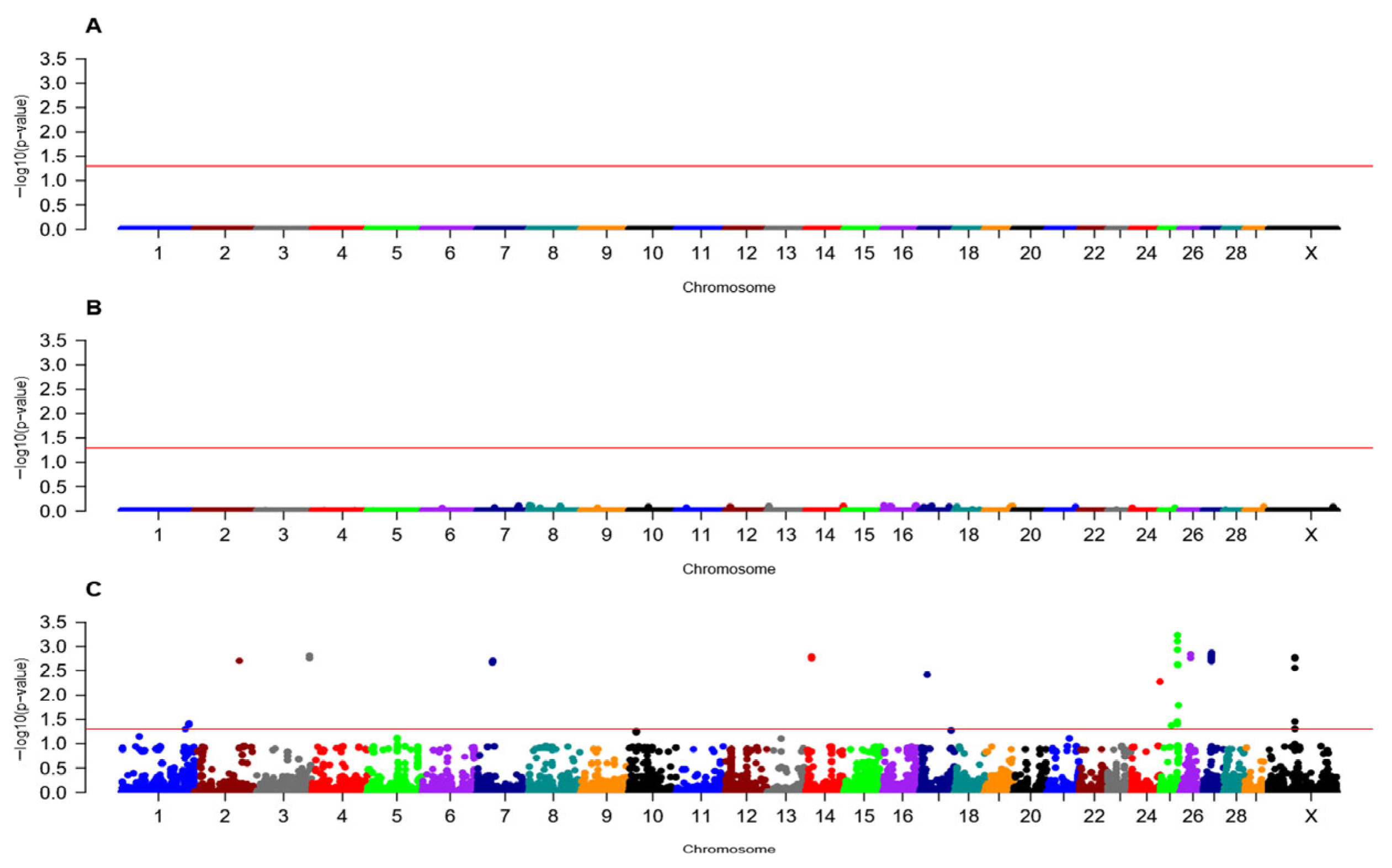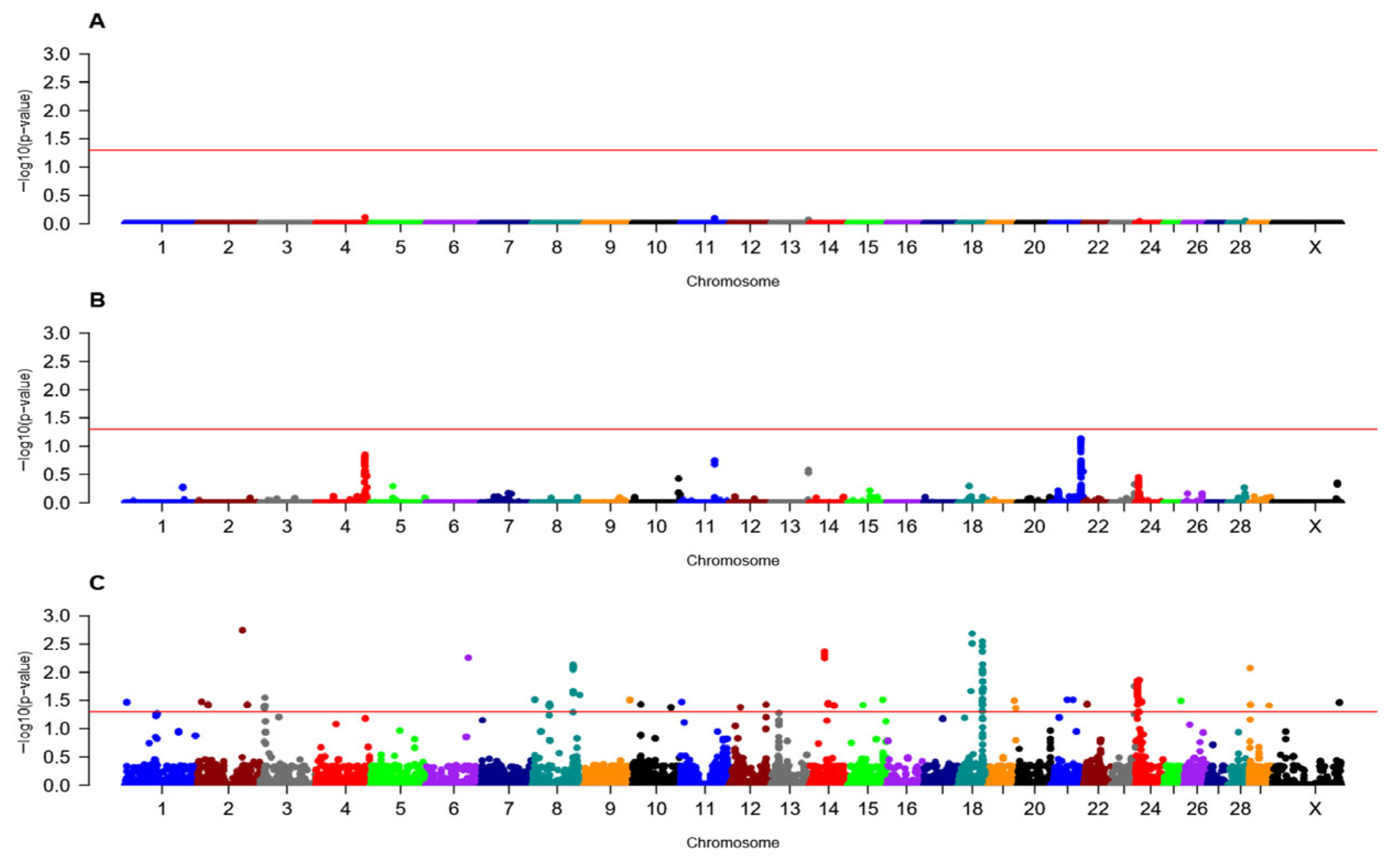 - Suarez, E.M.; Kelson, V.C.; Kiser, J.N.; Davenport, K.M.; Murdoch, B.M.; Herrick, A.L.; Neibergs, H.L. Loci Associated with Spontaneous Abortion in Primiparous Holstein Cattle. Front. Vet. Sci. 2025, 12, 1599401. [Google Scholar] [CrossRef] [PubMed]