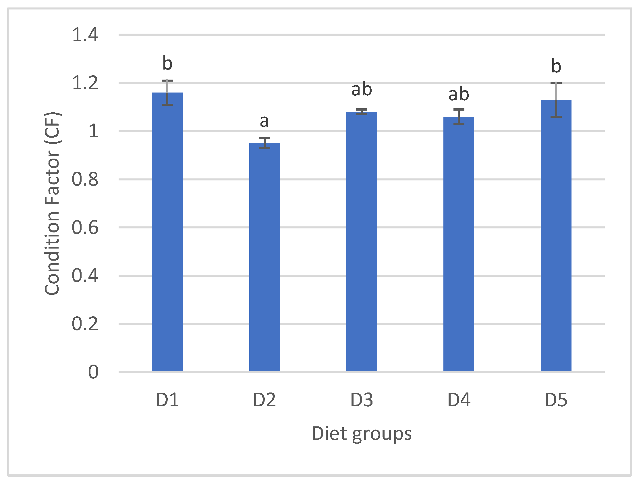 The type of dietary oil source used in this study had a substantial impact on the CF. Significantly higher CFs were observed in the D1 and D5 groups compared to the D2 diet group, which indicates the relative robustness of the fish in response to the respective diets. A previous study found a reduced CF for an SBO-based diet in rainbow trout compared to FO and other TOs, which completely correlates with the findings of this study [