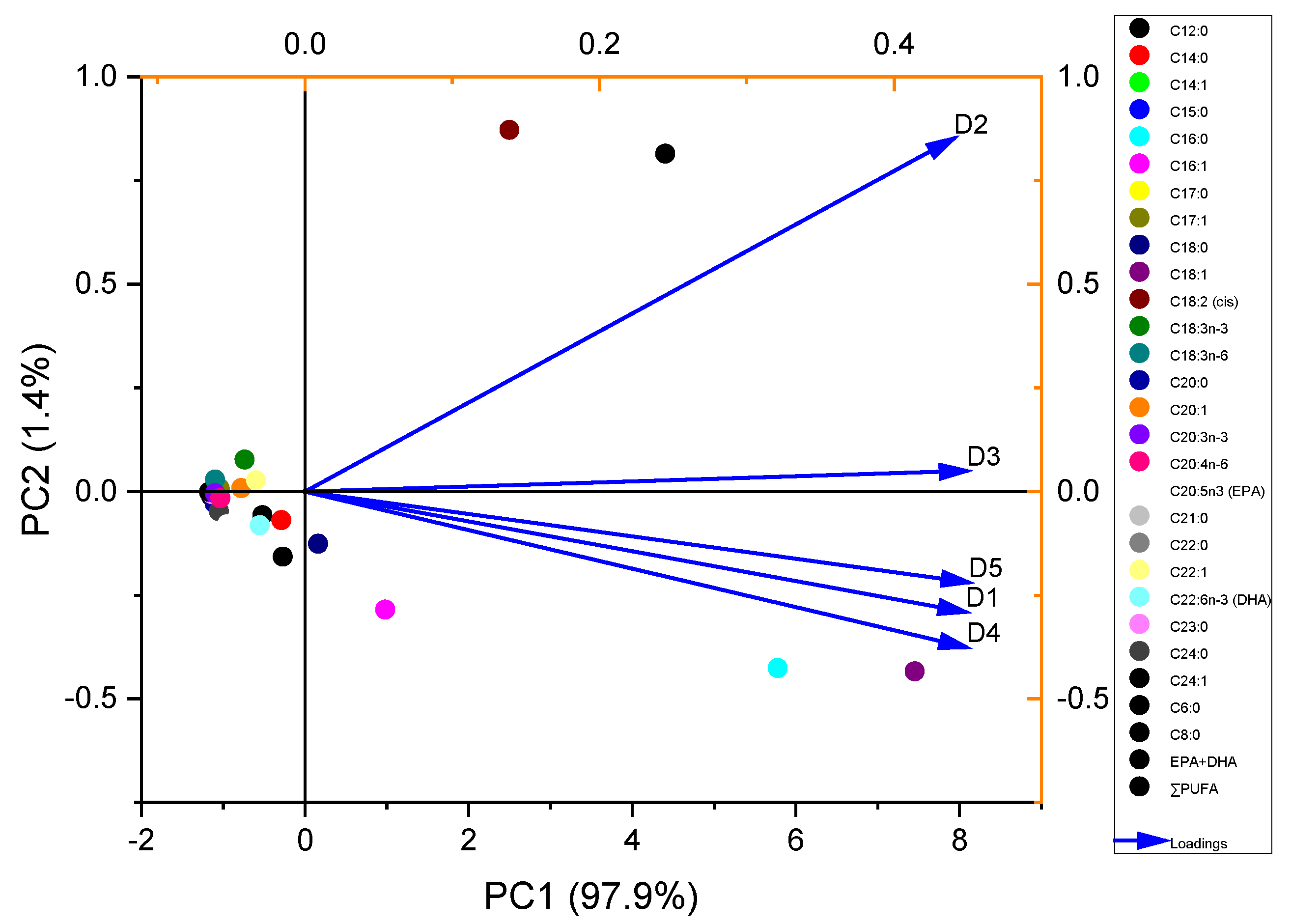 Principal component analysis (PCA) clearly differentiated the five dietary groups based on fatty acid composition. PC1 reflected overall fatty acid abundance, showing high positive loadings across all diets and strong associations with major fatty acids and total saturated fatty acids. By contrast, PC2 provided the strongest dietary separation, driven by high linoleic acid (C18:2 cis) content and negative total saturated fatty acids, representing a gradient between unsaturated and saturated profiles. Along with PC2, D2 was associated with higher unsaturated fatty acids, while the other diets clustered toward saturated profiles. PC3 further separated diets based on medium-chain and saturated fatty acids, with D3 contributing the most strongly. PC4 explained less variance but highlighted differences in long-chain poly-unsaturated fatty acids, particularly EPA and DHA. Overall, dietary separation was mainly driven by fatty acid composition, especially the saturated-to-unsaturated balance, rather than total lipid content.