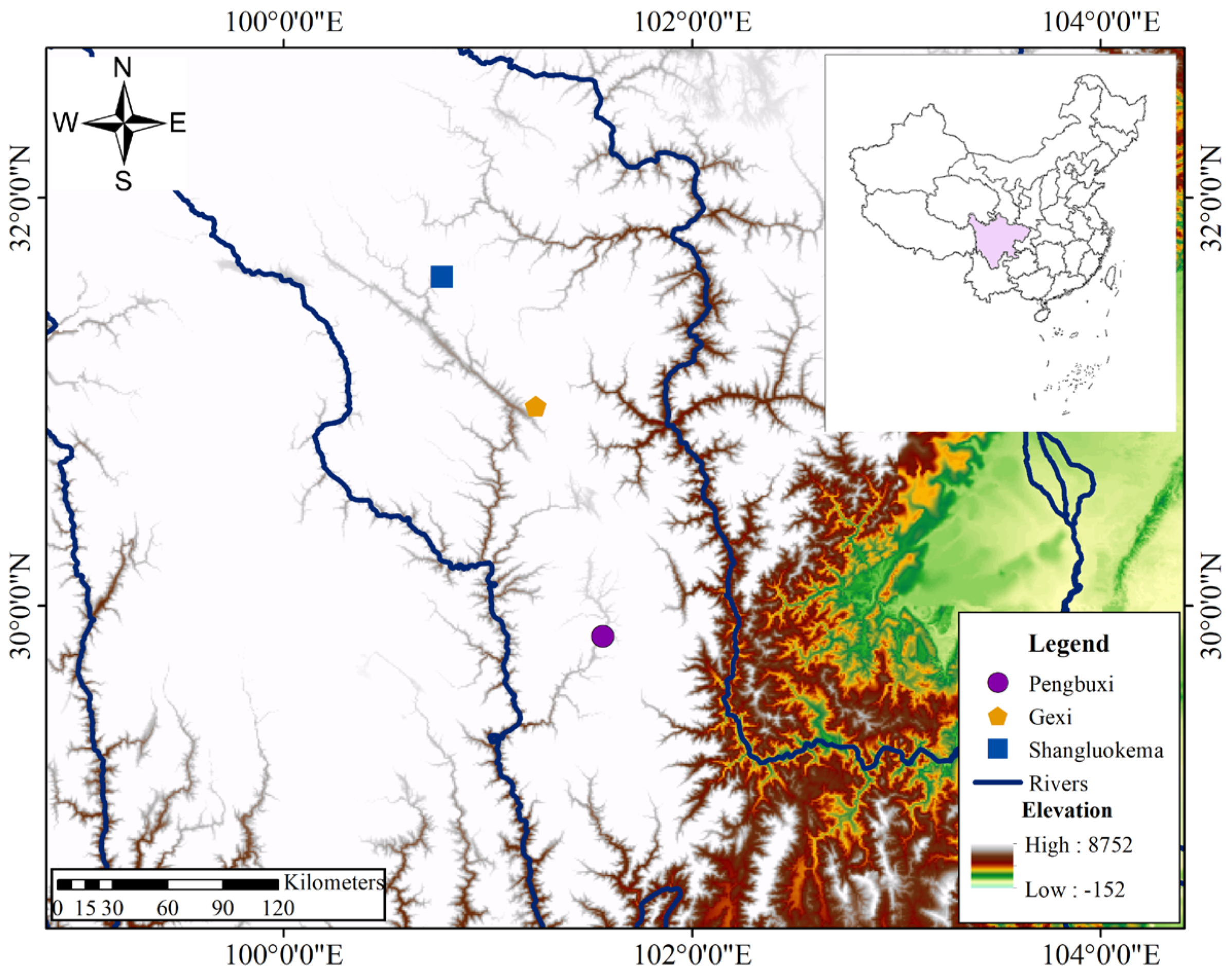 | Coordinates | 101°13′22.36″ E, 30°58′10.55″ N | 100°46′40.85″ E, 31°37′0.30″ N | 101°33′44.12″ E, 29°47′26.11″ N |