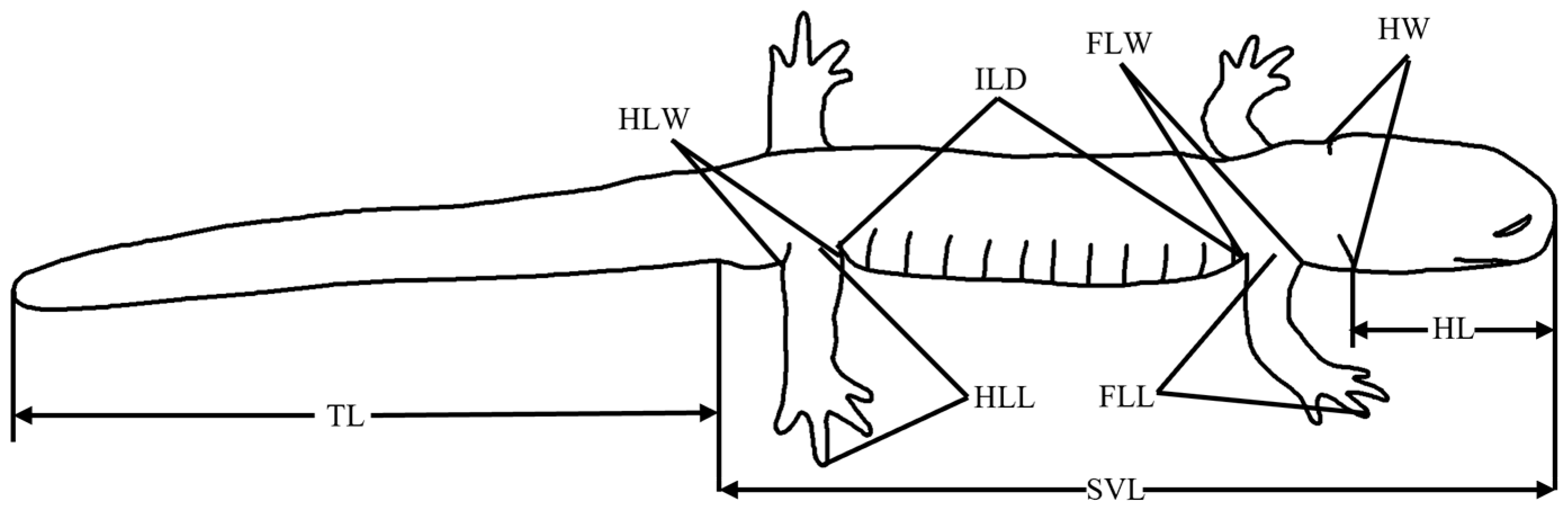 | snout-vent length | SVL | from the tip of snout to the posterior margin of the cloaca |