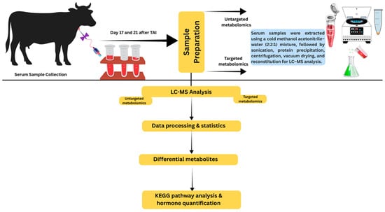 For metabolome analysis, blood samples were collected from a subset of dairy cows enrolled in the hCG-3 and hCG-3 plus ketoprofen experiment. To minimize the confounding effect of pregnancy status on circulating metabolites, only cows that were subsequently confirmed pregnant by ultrasonography at day 42 after TAI were included in the metabolomic analysis (n = 22 cows). Serum samples of cows diagnosed as non-pregnant were excluded from all metabolomic and pathway analyses. For metabolomic analysis, serum samples were collected at two time points during early pregnancy, day 17 and day 21 after TAI. Serum samples collected on day 17 of the TAI treatment regimen from cows of two groups: (hCG-3 only) and (hCG+ketoprofen) were designated as Group C4 (hCG-3 only) and G4 (hCG-3 plus ketoprofen). Samples collected on day 21 of the TAI were designated as Group C5 (hCG-3 only) and Group G5 (hCG-3 plus ketoprofen). There were 10 mL of blood collected on days 17 and 21 TAI via the jugular vein of each animal using an 18 G needle into a plain (non-anticoagulant) blood collection tube (BD Vacutainer, Franklin Lakes, NJ, USA). The samples were allowed to clot at room temperature for 30 min, then placed on ice and transported to the laboratory. Samples were subsequently centrifuged at 2000× g for 15 min at 4 °C. Two 500 μL aliquots of serum were collected and stored at −80 °C for metabolomic analysis. Samples were maintained at −80 °C until further processing. A schematic overview of the experimental workflow, including sample collection, untargeted metabolomics analysis and targeted metabolite quantification, is presented in Figure 2.