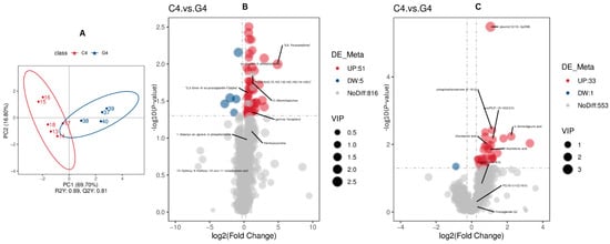 Partial Least Squares Discriminant Analysis (PLS-DA) was used to determine a relationship model between metabolite abundance and sample categories, allowing for reliable discrimination and prediction of sample classification. To discriminate the differentially abundant metabolites between C4 and G4, a supervised PLS-DA model was utilized. As depicted in Figure 4, the evaluation model yielded R2Y values of 0.89 in combined mode, while the corresponding Q2 values were 0.81 (Figure 4A). The relatively greater R2Y values compared to Q2 indicate the model reliability.