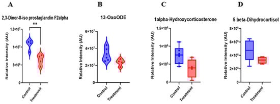 Following filtering for metabolites relevant to reproduction and fertility with a fold change (FC) > 1.2, eight differentially abundant metabolites were identified between cows of the C4 and G4 samples (Table 2). Notably, 2,3-Dinor-8-iso PGF2α and 13-OxoODE had relatively lesser intensities in the hCG+keoprofen treatment compared with the hCG-3 group (Figure 5A,B). Thus, the results from treatment of cows with the ketoprofen compound indicate there was mitigation of oxidative damage via neutralizing free radicals and preventing lipid peroxidation. This finding is considered to indicate that the treatment successfully reduces lipid peroxidation and inflammatory processes. Similarly, steroid-related metabolites, including 1α-hydroxycorticosterone and 5β-dihydrocortisol, were downregulated in cows of the treatment group (Figure 5C,D). This pattern suggests a modulation of glucocorticoid metabolism, which may reflect reduced activation of stress-associated endocrine pathways.