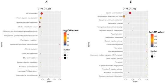 For C4 and G4 comparison, there were a total of 90 differentially abundant metabolites in both positive and negative mode (Figure 4B,C). A heat map displaying all differentially abundant metabolites in both modes is provided in Supplementary Figure S2A,B.