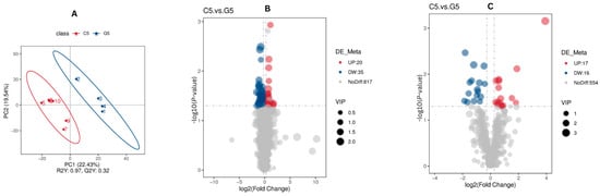 Screening of differentially abundant metabolites associated with reproduction and fertility (C5 compared with G5). The PLS-DA scatter plots for (A) combine positive ion and negative ion modes, where the x- and y-axes represent scores on the first and second principal components. The R2Y value indicates model fit, Q2Y value reflects predictive capacity and models are robust when R2Y > Q2Y. Volcano plots for (B) positive and (C) negative modes indicate metabolites that were not differentially abundant (gray), upregulated (red) and downregulated (blue), with VIP values indicating metabolite contribution to group separation.