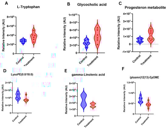 Following filtering for metabolites relevant to reproduction and fertility with a fold change (FC) > 1.2, nine differentially abundant metabolites were identified between samples from cows in the C5 and G5 groups (Table 3). Notably, L-Tryptophan, Glycolic acid and 3α,20α-dihydroxy-5β-pregnane glucuronide exhibited relatively greater intensities in the treatment group compared with the hCG-3 group (Figure 8A–C). Conversely, gamma-Linolenic acid, 12(13)-EpOME and LysoPE(20:3) had lesser intensities in the cows of the treatment group compared to the hCG-3 group (Figure 8D–F).