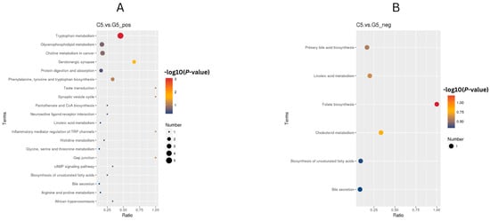 KEGG enrichment analysis of C5 and G5 (A) Upregulated and (B) downregulated pathways (FDR < 0.05) in G5 versus C5 comparison. Color indicates (−log10 (p-value)), size indicates gene count, x-axis is indicative of enrichment ratio. Results indicate there was enhanced tryptophan metabolism and serotonergic signaling with suppressed steroid precursor pathways, suggesting coordinated remodeling of amino acid, neuroendocrine and lipid metabolism.