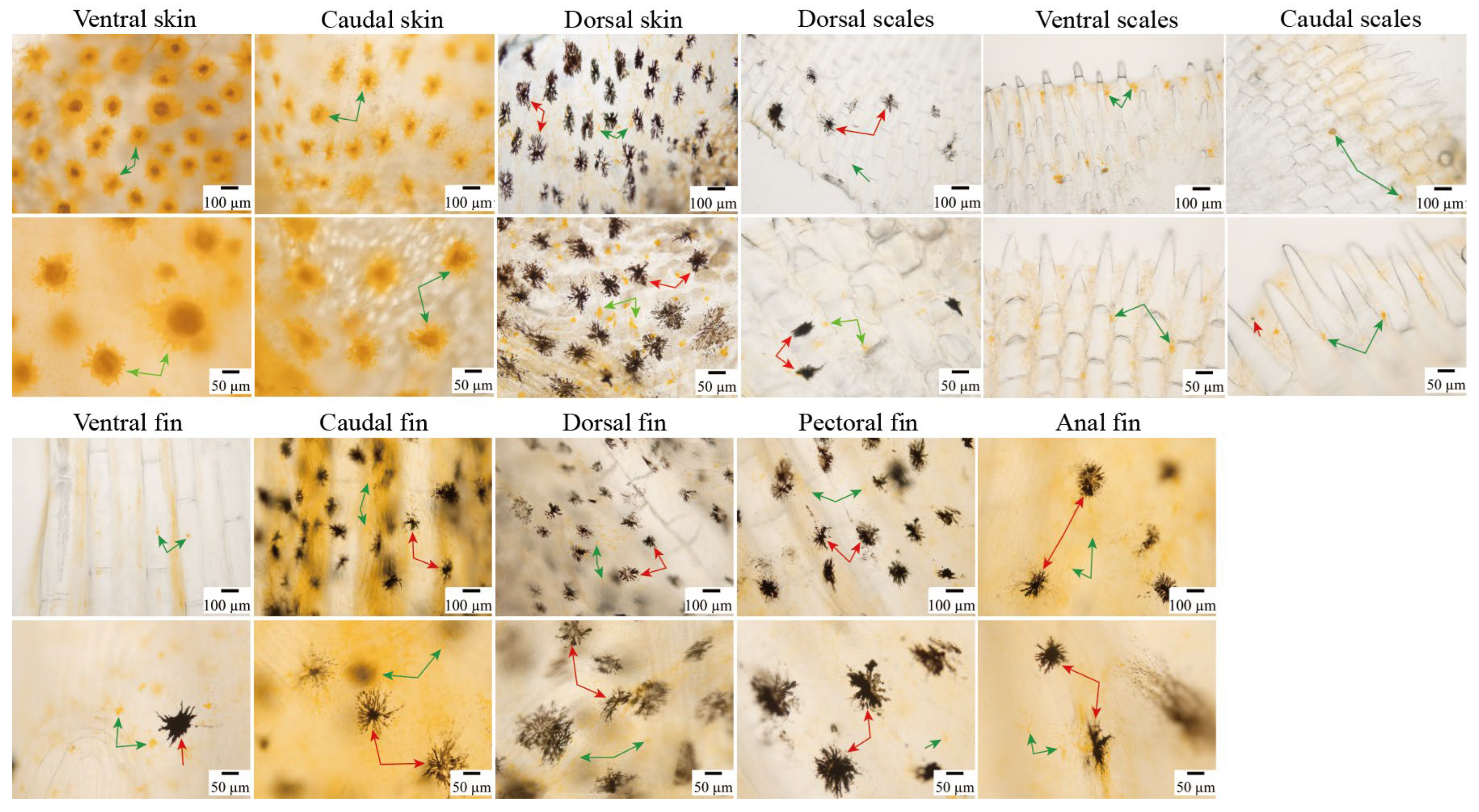 3.3. Distribution of Chromatophores in the Skin, Scales, and Fins of Large Yellow Croaker