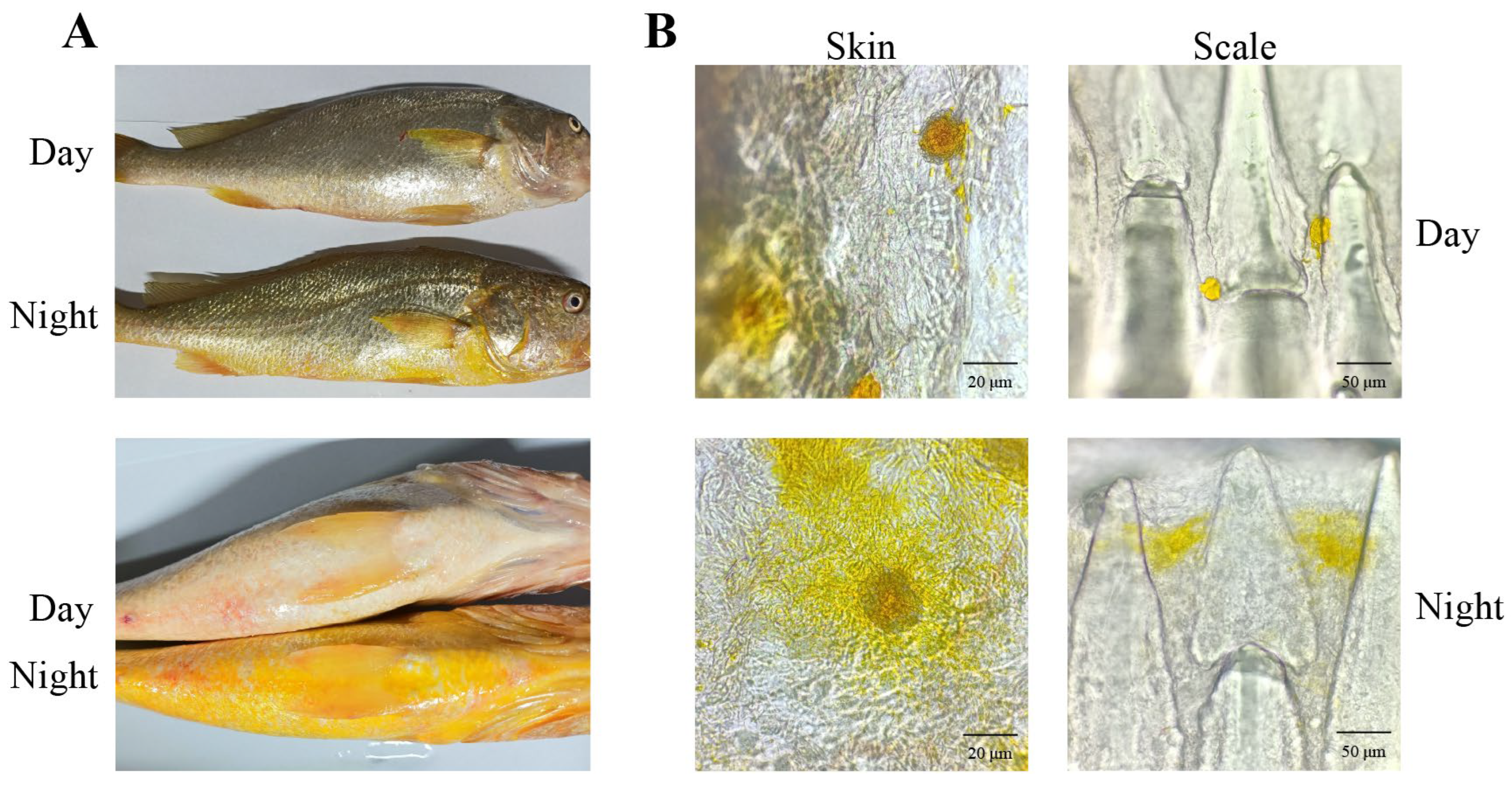 3.4. Diurnal Color Variation and Xanthophore Dynamics in Large Yellow Croaker