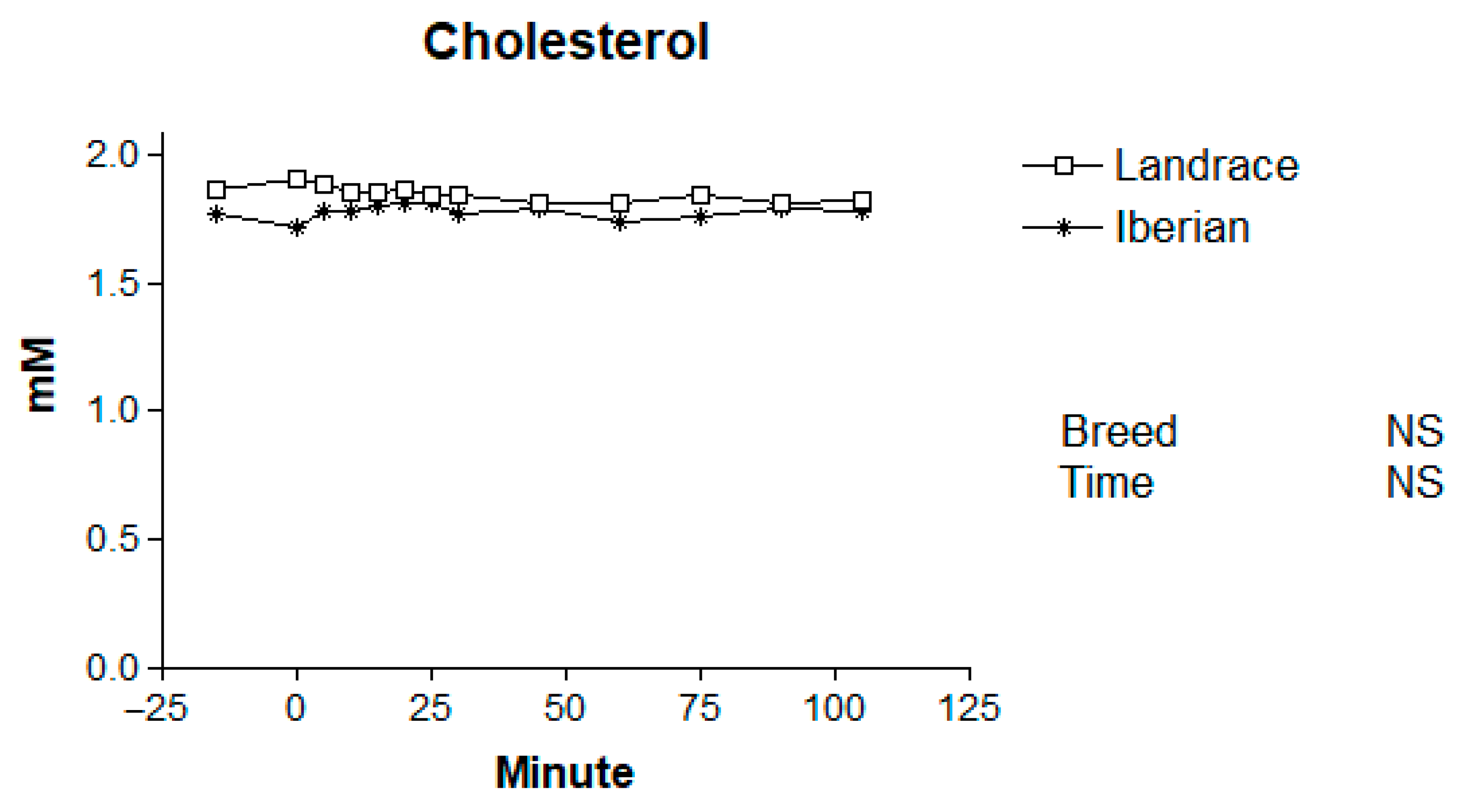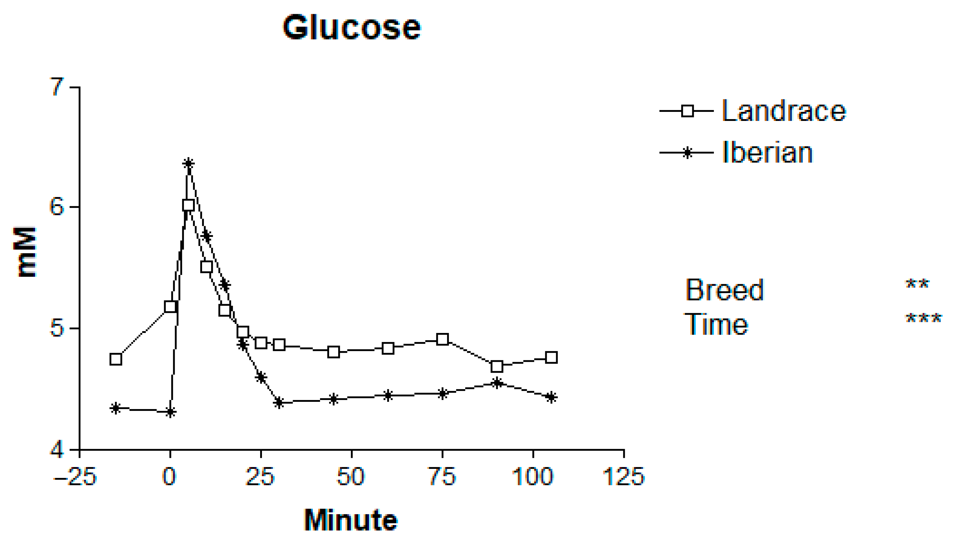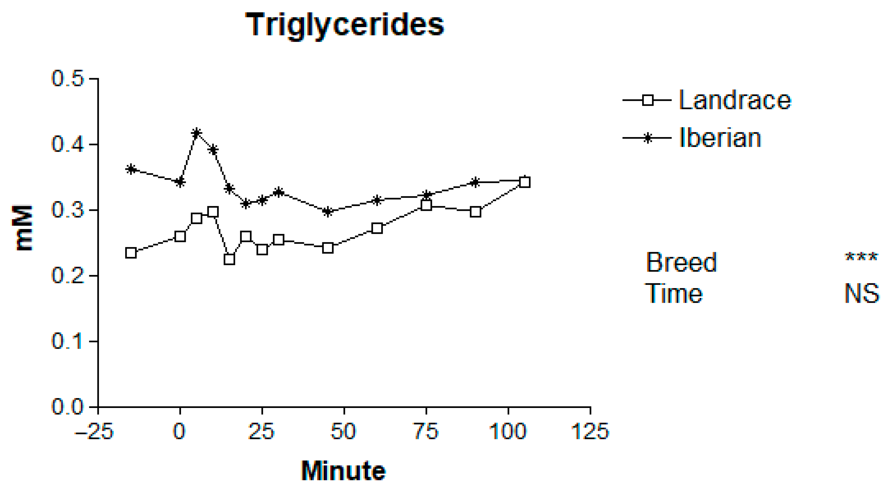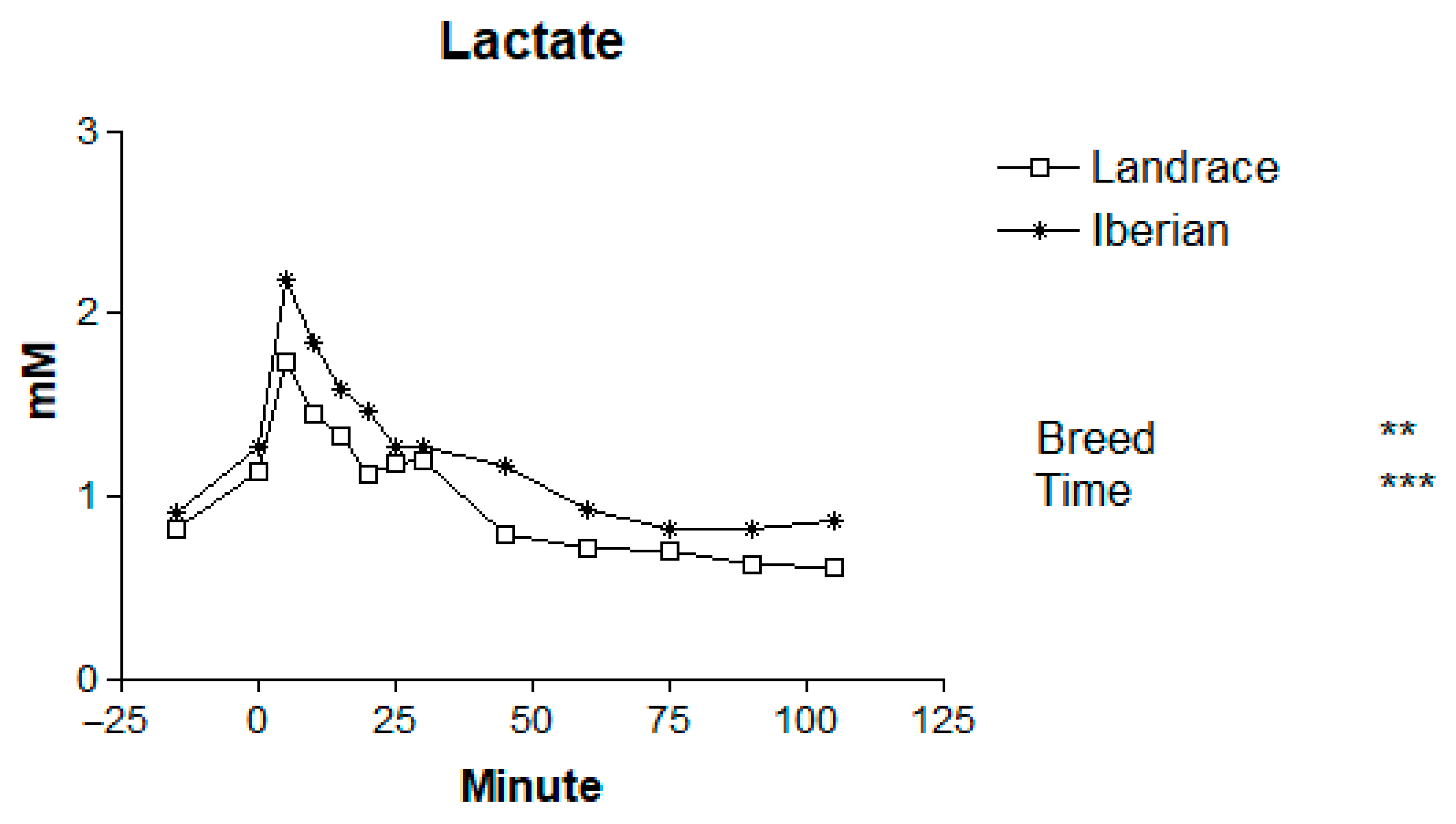| Trait | Landrace | Iberian | SEM | Breed (B) | Time (T) | B × T |