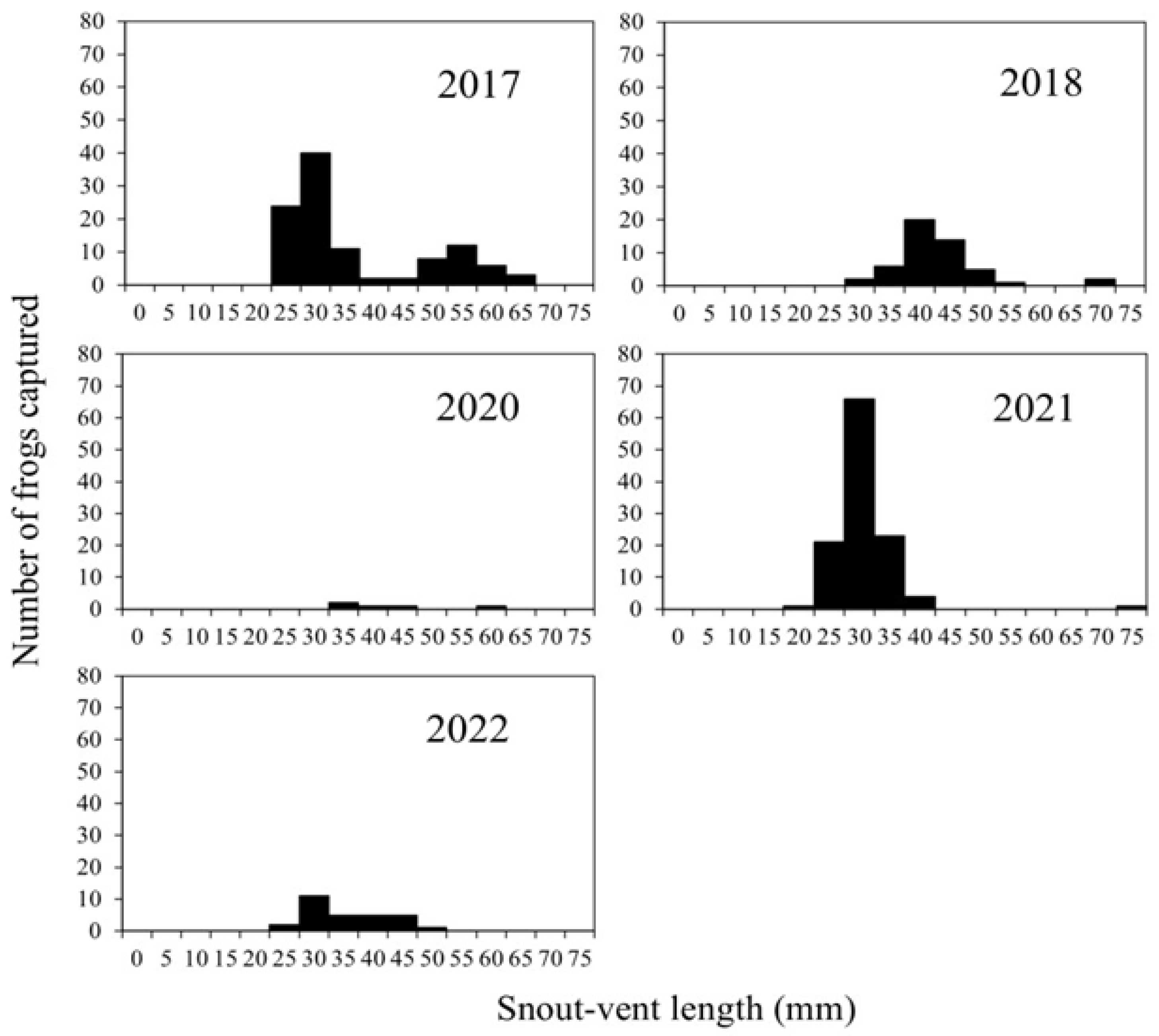 APA StyleNakajima, R., Azumi, D., Tada, M., Nakaichi, J., Katsuhara, K. R., & Nakata, K. (2026). Impact of the July 2018 Heavy Rain Disaster on the Endangered Nagoya Daruma Pond Frog (Pelophylax porosus brevipodus) in Rice Fields of Mabi Town, Kurashiki City, Western Japan: Changes in Population Structure over Five Years. Animals, 16(3), 369. https://doi.org/10.3390/ani16030369