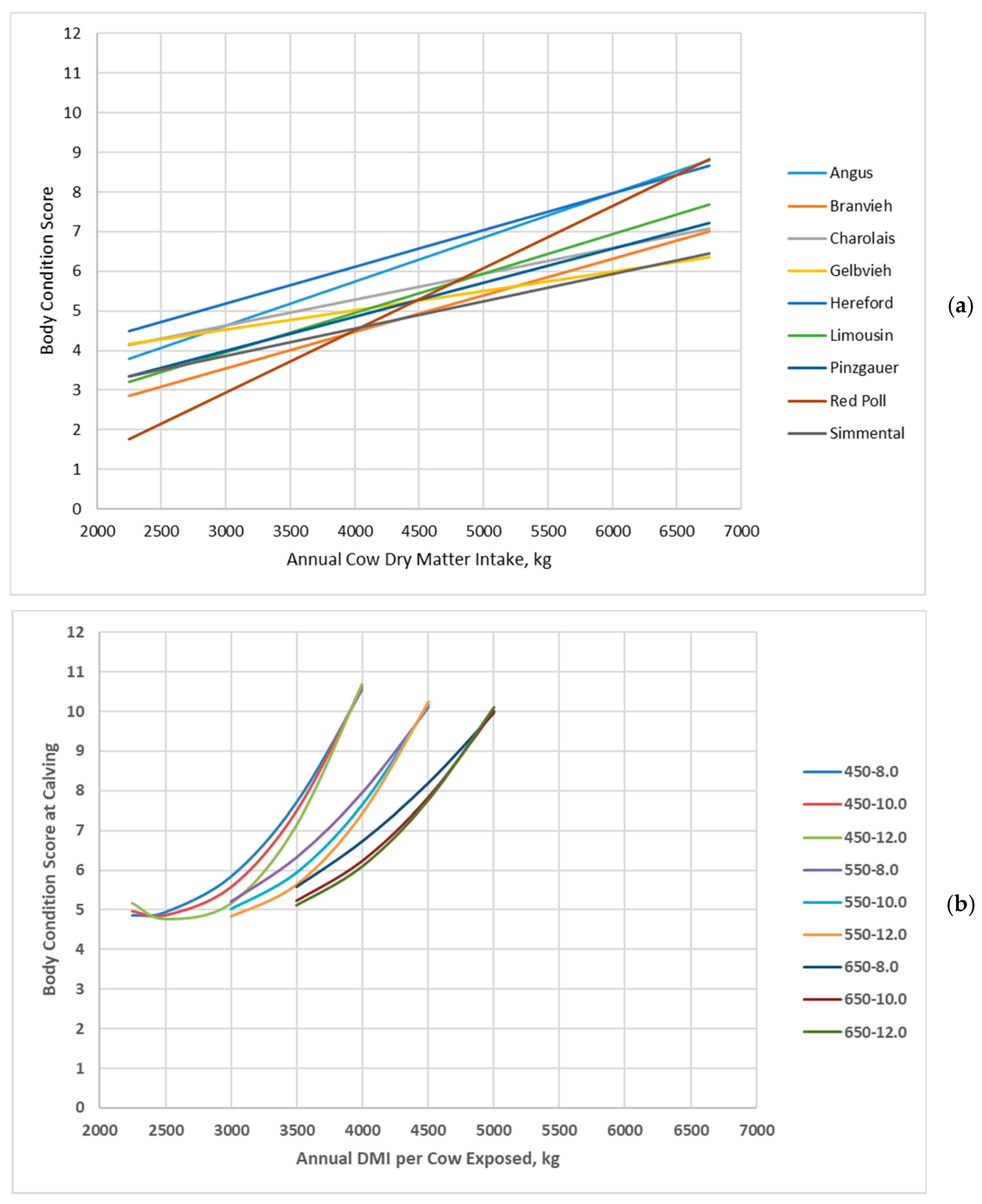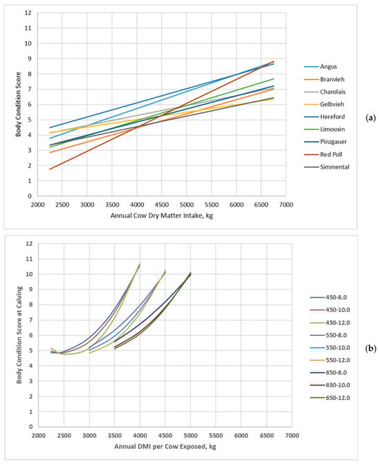 Body condition score of cow genotypes in relation with annual cow dry matter intake: (a) Data adapted from Jenkins and Ferrell [20]; (b) Data simulated by the Beef Cattle Systems Model. Panel (a): Angus, Braunvieh, Charolais, Gelbvieh, Hereford, Limousin, Pinzgauer, Red Poll, and Simmental refer to breeds of cows used by Jenkins and Ferrell [20]. Panel (b): 450-8.0, 450-10.0, 450-12.0, 550-8.0, 550-10.0, 550-12.0, 650-8.0, 650-10.0, and 650-12.0 represent the combinations of mature shrunk body weight (MSBW) and peak milk yield (e.g., 450 MSBW-8.0 peak milk) used in Beef Cattle Systems Model simulations.
