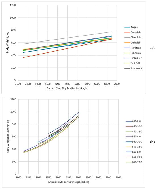 Cow body weight linearly increased with increasing annual dry matter intake, and cow genotype interacted with annual dry matter intake for Jenkins and Ferrell [20] (Figure 3a). Likewise, cow body weight at calving increased with increasing annual dry matter intake for all cow genotypes in the BCSM; however, all cow genotypes increased at similar rates with increasing annual dry matter intake (Figure 3b). Also, cow body weight more rapidly increased with increasing annual dry matter intake and to a greater extent at greater annual dry matter intakes in the BCSM compared to Jenkins and Ferrell [20].