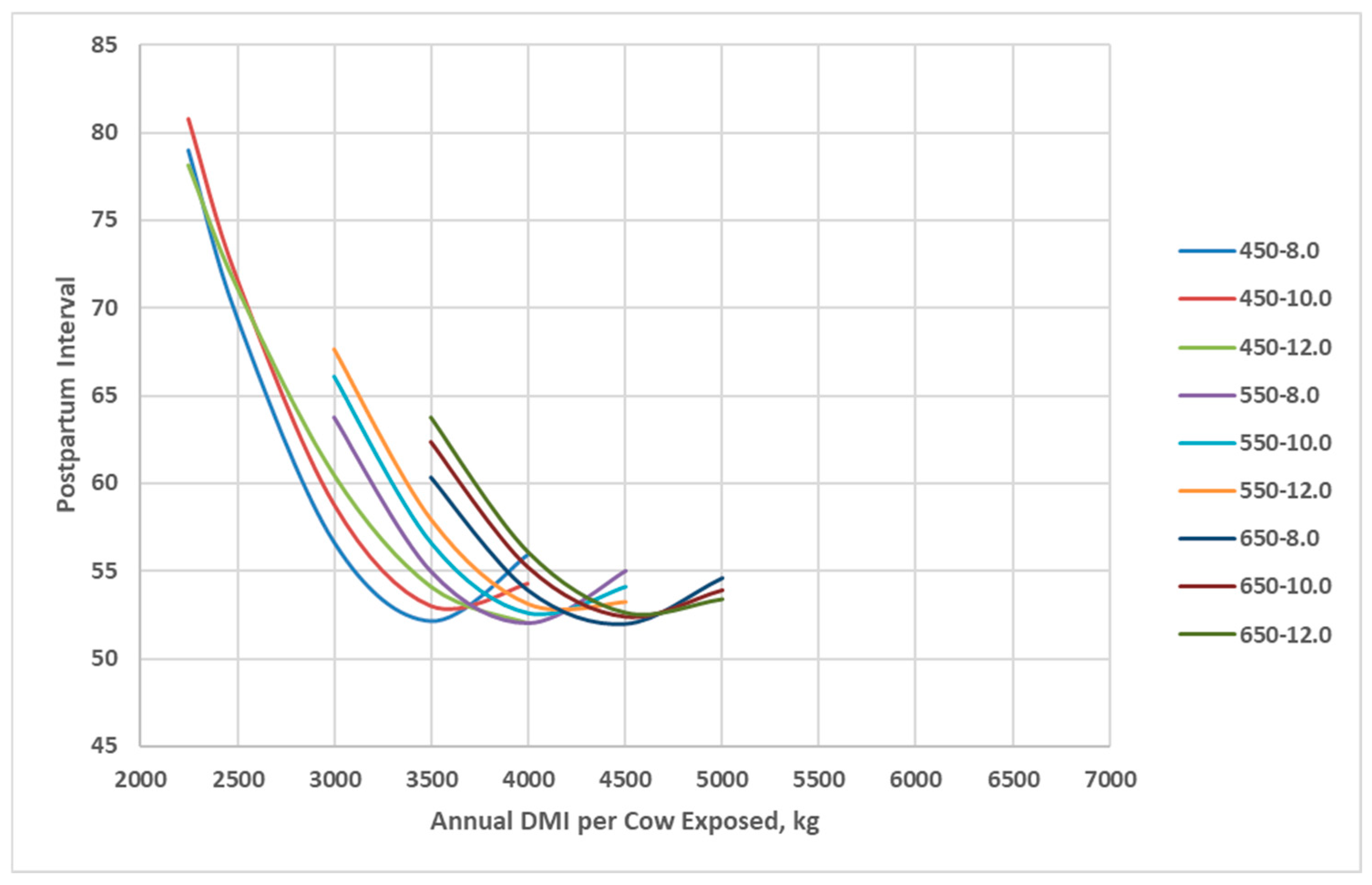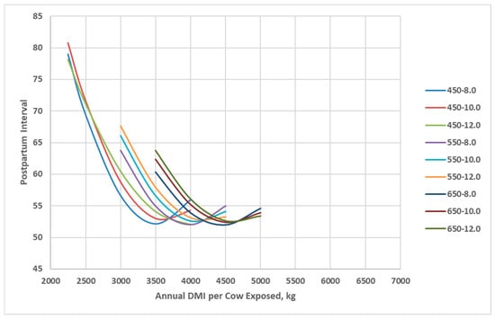 Postpartum interval of cow genotypes in relation with annual cow dry matter intake as simulated by the Beef Cattle Systems Model. 450-8.0, 450-10.0, 450-12.0, 550-8.0, 550-10.0, 550-12.0, 650-8.0, 650-10.0, and 650-12.0 represent the combinations of mature shrunk body weight (MSBW) and peak milk yield (e.g., 450 MSBW-8.0 peak milk) used in Beef Cattle Systems Model simulations.