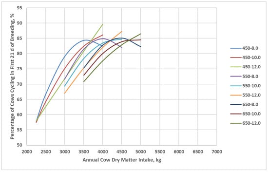 Percent of cows cycling in the first 21 d period of the breeding season of cow genotypes in relation to annual cow dry matter intake as simulated by the Beef Cattle Systems Model. 450-8.0, 450-10.0, 450-12.0, 550-8.0, 550-10.0, 550-12.0, 650-8.0, 650-10.0, and 650-12.0 represent the combinations of mature shrunk body weight (MSBW) and peak milk yield (e.g., 450 MSBW-8.0 peak milk) used in Beef Cattle Systems Model simulations.