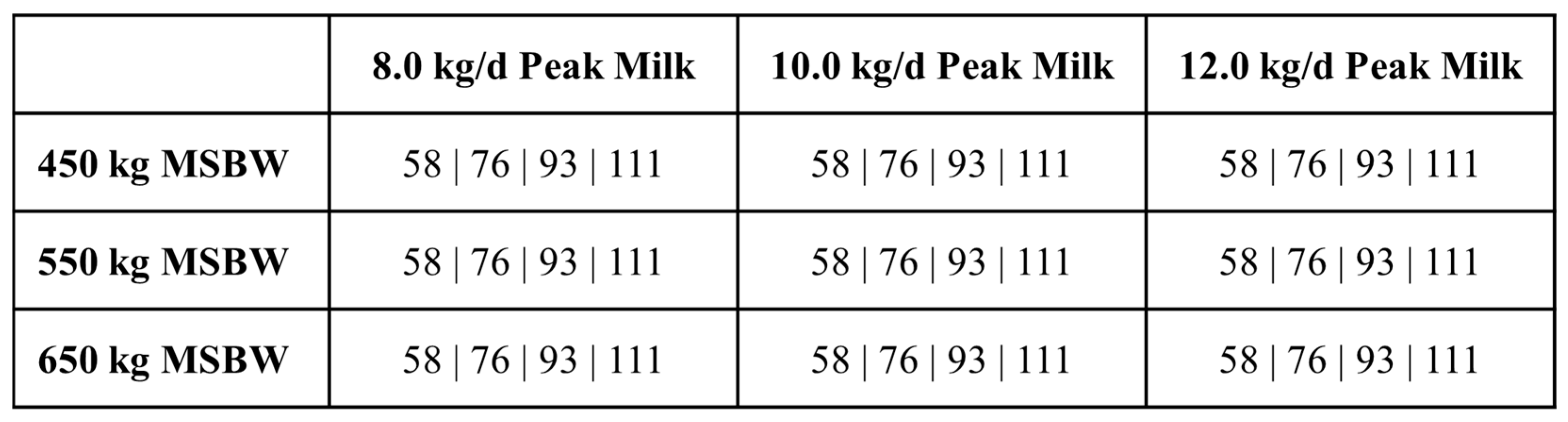The purpose of this analysis was to evaluate whether the BCSM could accurately simulate the cow genotype–nutritional environment interactions reported by Jenkins and Ferrell [20]. Results of Jenkins and Ferrell [20] are adapted and presented alongside outputs from the BCSM simulations for ease of comparison. Jenkins and Ferrell [20] used cows with mature weights ranging from 474 to 675 kg and peak milk yields ranging from 8.5 to 11.9 kg/d [33], which is similar to the mature cow weights ranging from 450 to 650 kg and peak milk yields ranging from 8.0 to 12.0 kg/d used in the BCSM simulations.