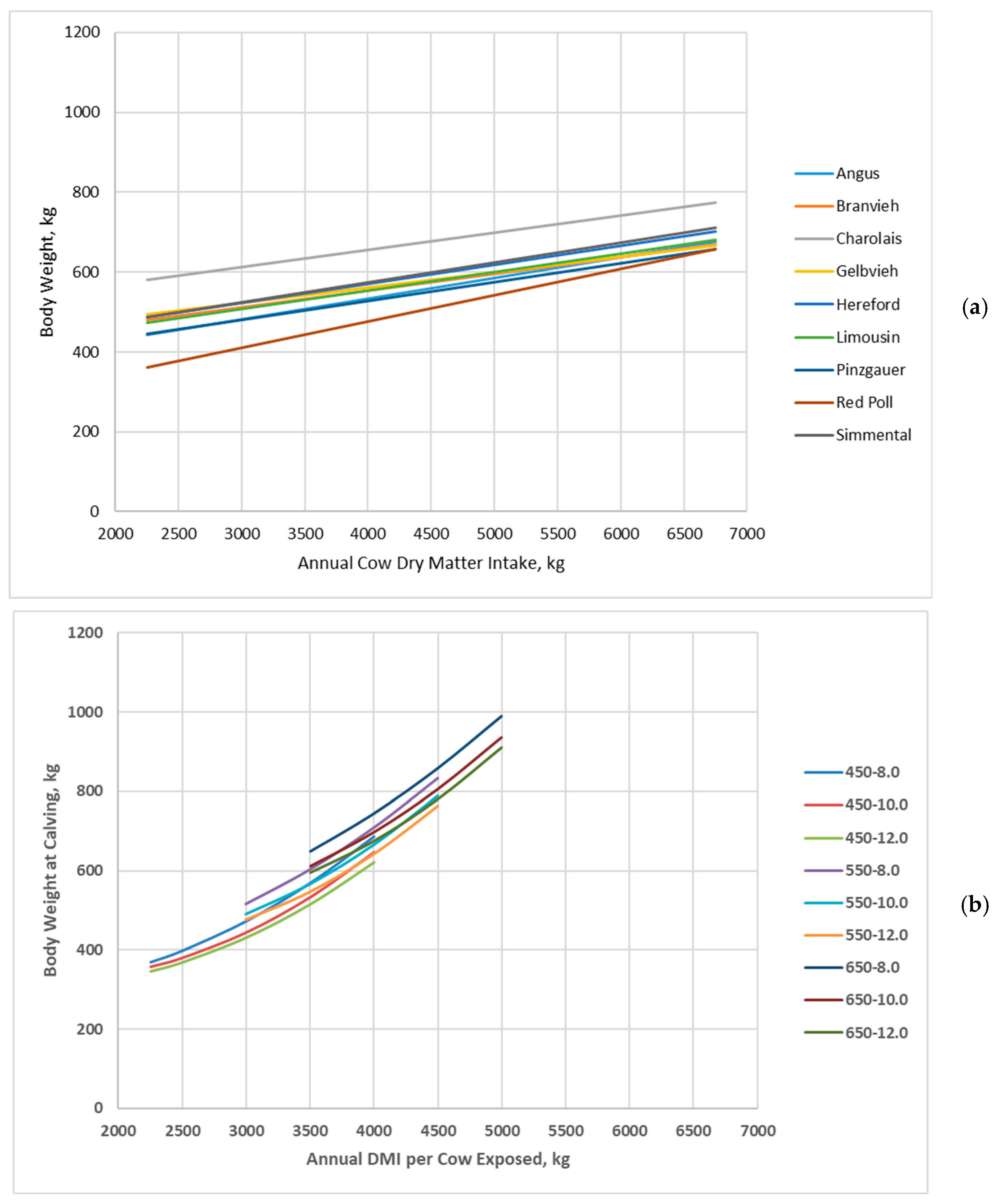 Body weight of cow genotypes in relation with annual cow dry matter intake: (a) Data adapted from Jenkins and Ferrell [20]; (b) Data simulated by the Beef Cattle Systems Model. Panel (a): Angus, Braunvieh, Charolais, Gelbvieh, Hereford, Limousin, Pinzgauer, Red Poll, and Simmental refer to breeds of cows used by Jenkins and Ferrell [20]. Panel (b): 450-8.0, 450-10.0, 450-12.0, 550-8.0, 550-10.0, 550-12.0, 650-8.0, 650-10.0, and 650-12.0 represent the combinations of mature shrunk body weight (MSBW) and peak milk yield (e.g., 450 MSBW-8.0 peak milk) used in Beef Cattle Systems Model simulations.