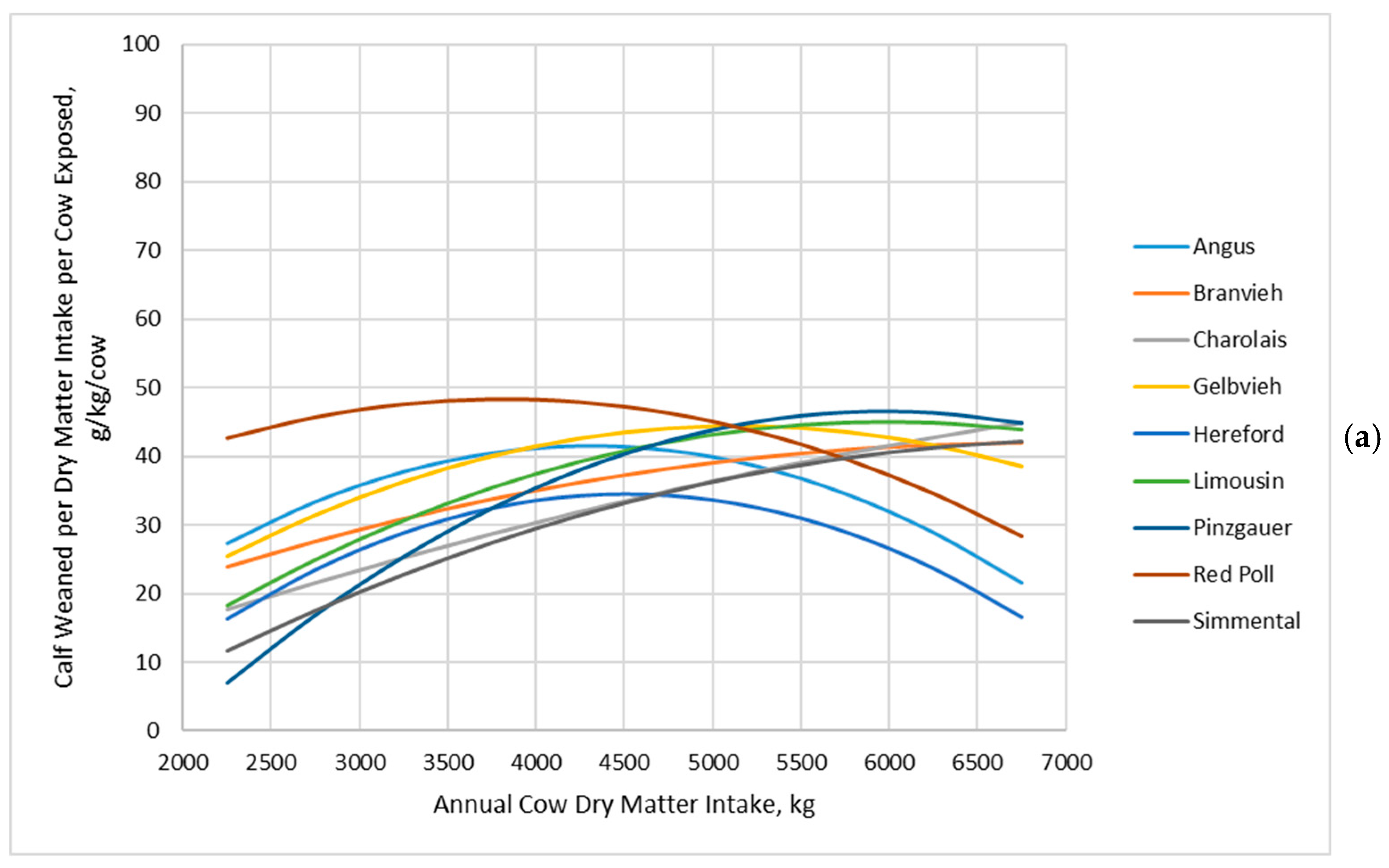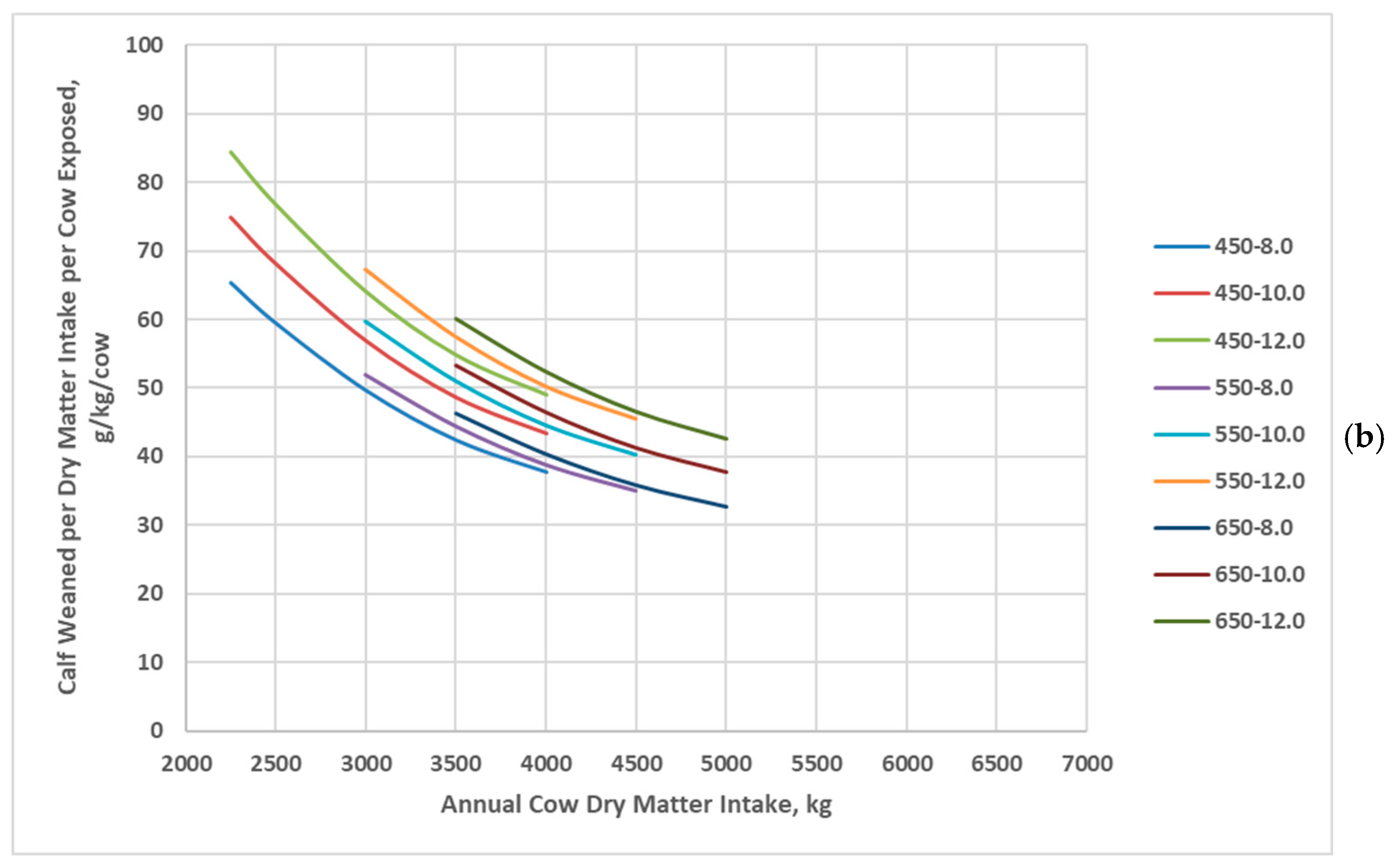 Grams of calf weaned per kilogram of dry matter intake per cow exposed of cow genotypes in relation with annual cow dry matter intake: (a) Data adapted from Jenkins and Ferrell [20]; (b) Data simulated by the Beef Cattle Systems Model. Panel (a): Angus, Braunvieh, Charolais, Gelbvieh, Hereford, Limousin, Pinzgauer, Red Poll, and Simmental refer to breeds of cows used by Jenkins and Ferrell [20]. Panel (b): 450-8.0, 450-10.0, 450-12.0, 550-8.0, 550-10.0, 550-12.0, 650-8.0, 650-10.0, and 650-12.0 represent the combinations of mature shrunk body weight (MSBW) and peak milk yield (e.g., 450 MSBW-8.0 peak milk) used in Beef Cattle Systems Model simulations.