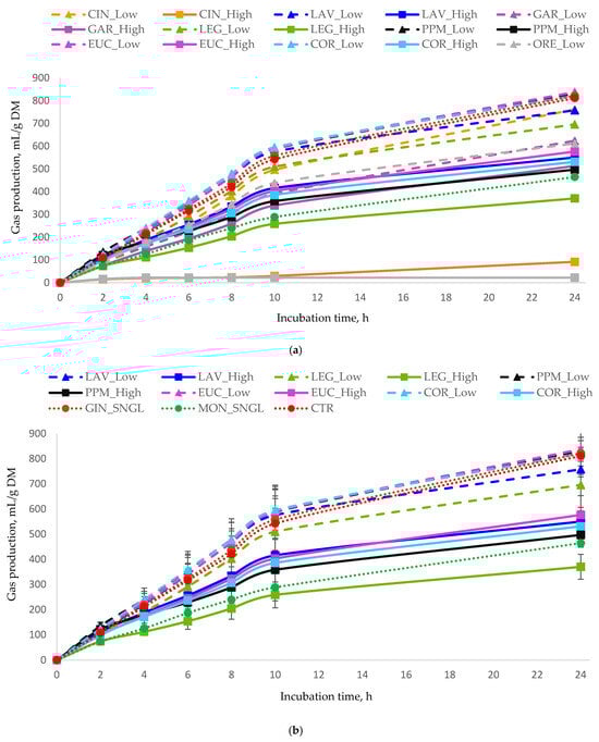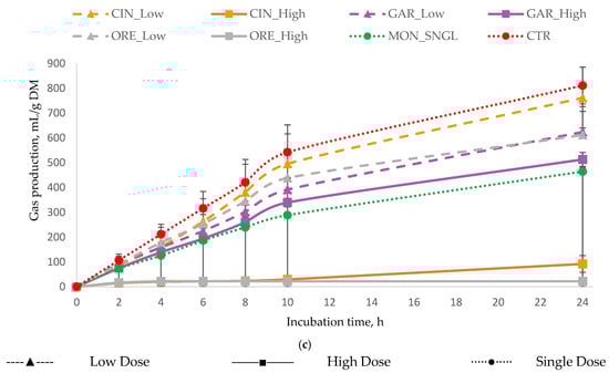 In vitro cumulative gas production (mL of gas/g DM) as a function of incubation time for (a) all essential oils, (b) terpenoid essential oils, and (c) non-terpenoid essential oils. Monensin (MON) and the control (CTR) are included in all panels as reference treatments. For each treatment, inclusion levels are distinguished by line style and marker type. Error bars represent standard deviation (SD) and are shown only in grouped panels to illustrate variability while maintaining figure clarity. Treatments: LAV = lavender; LEG = lemongrass; PPM = peppermint; EUC = eucalyptus; COR = coriander; GIN = ginger; CIN = cinnamon; ORE = oregano; GAR = garlic; MON = monensin; CTR = control.
