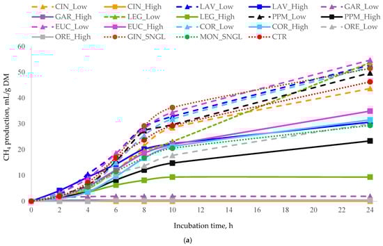 Substantial variation was observed in the reduction of cumulative gas production at 24 h among treatments, with decreases ranging from −14% to −54% (from 696 to 370 gas mL/g DM), compared to the CTR (Table 3). The greatest reduction in total gas production was observed with treatment LEG_High, followed by MON_SNGL, while PPM_High and GAR_High also resulted in substantial reductions. Some of the treatments showed a moderate decrease ranging from −23% to −35%. In contrast, none of the treatments increased total gas production compared with the CTR.