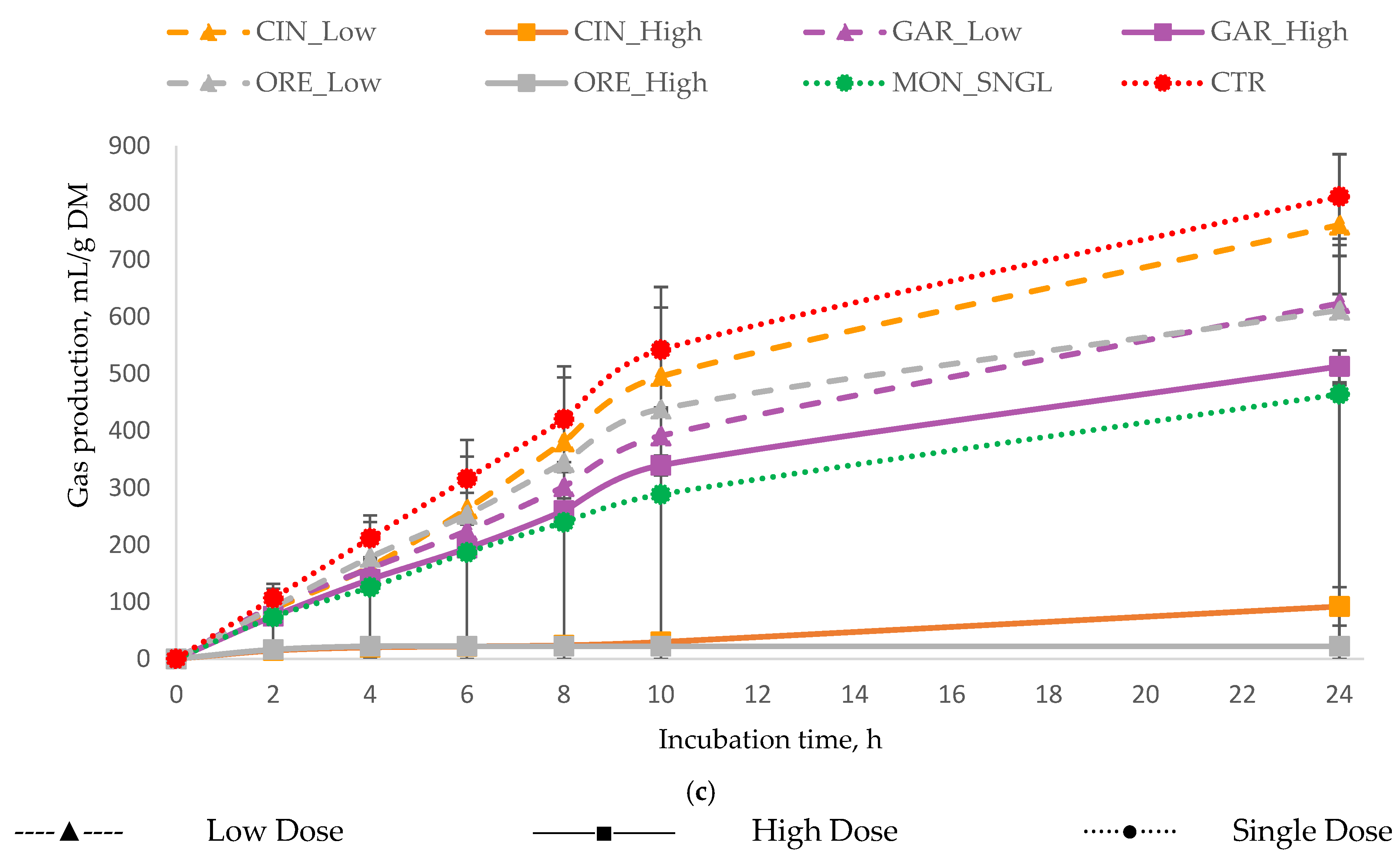 - Roy, D.; Tomar, S.K.; Sirohi, S.K.; Kumar, V.; Kumar, M. Efficacy of Different Essential Oils in Modulating Rumen Fermentation In Vitro Using Buffalo Rumen Liquor. Vet. World 2014, 7, 220–226. Available online: https://www.veterinaryworld.org/Vol.7/April-2014/5.pdf (accessed on 1 June 2025). [CrossRef]