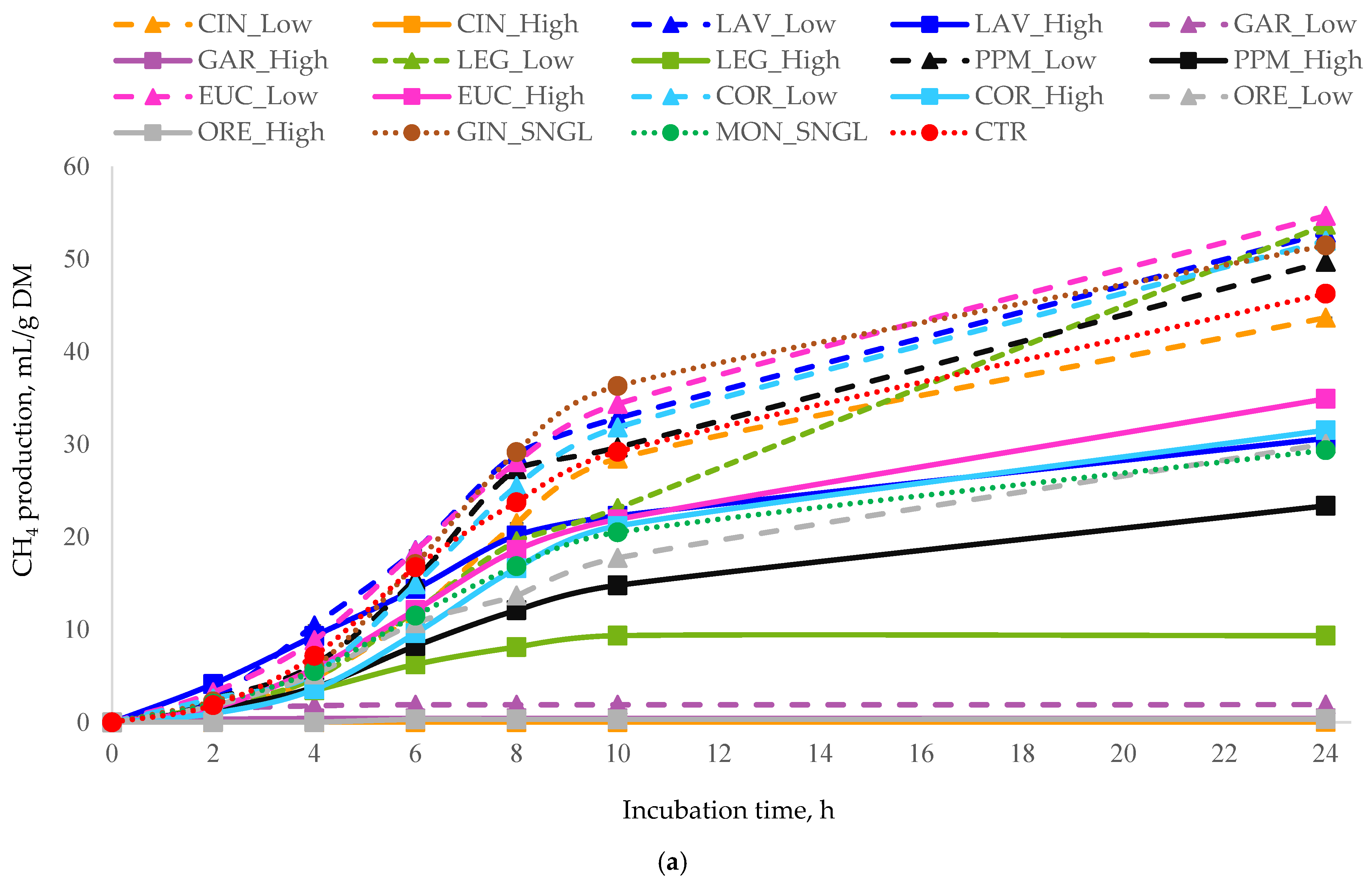 - Pawar, M.M.; Kamra, D.N.; Agarwal, N.; Chaudhary, L.C. Effects of Essential Oils on In Vitro Methanogenesis and Feed Fermentation with Buffalo Rumen Liquor. Agric. Res. 2014, 3, 67–74. [Google Scholar] [CrossRef]