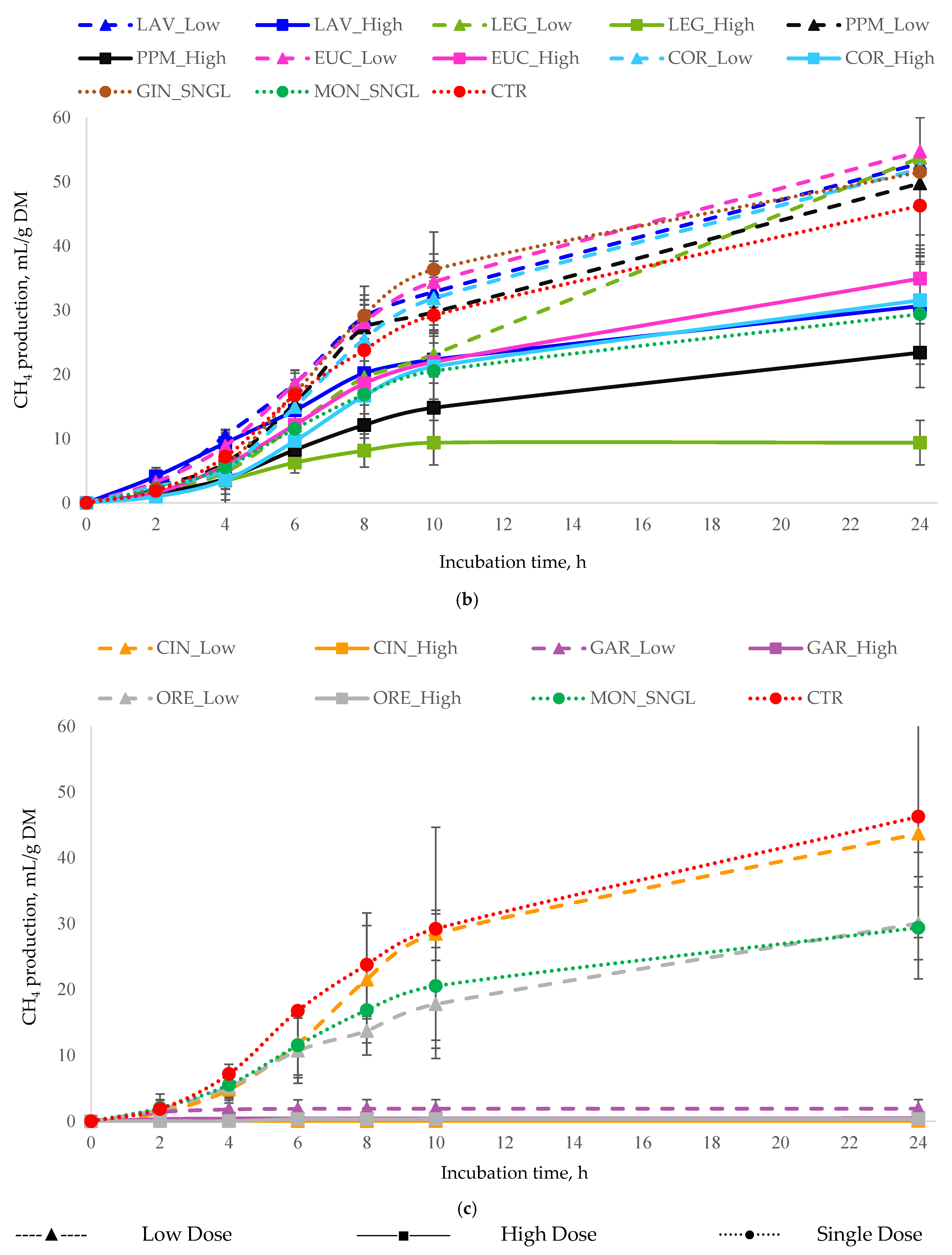 - Lin, B.; Wang, J.; Lu, Y.; Liang, Q.; Liu, J. In Vitro Rumen Fermentation and Methane Production Are Influenced by Active Components of Essential Oils Combined with Fumarate. J. Anim. Physiol. Anim. Nutr. 2013, 97, 1–9. [Google Scholar] [CrossRef] [PubMed]