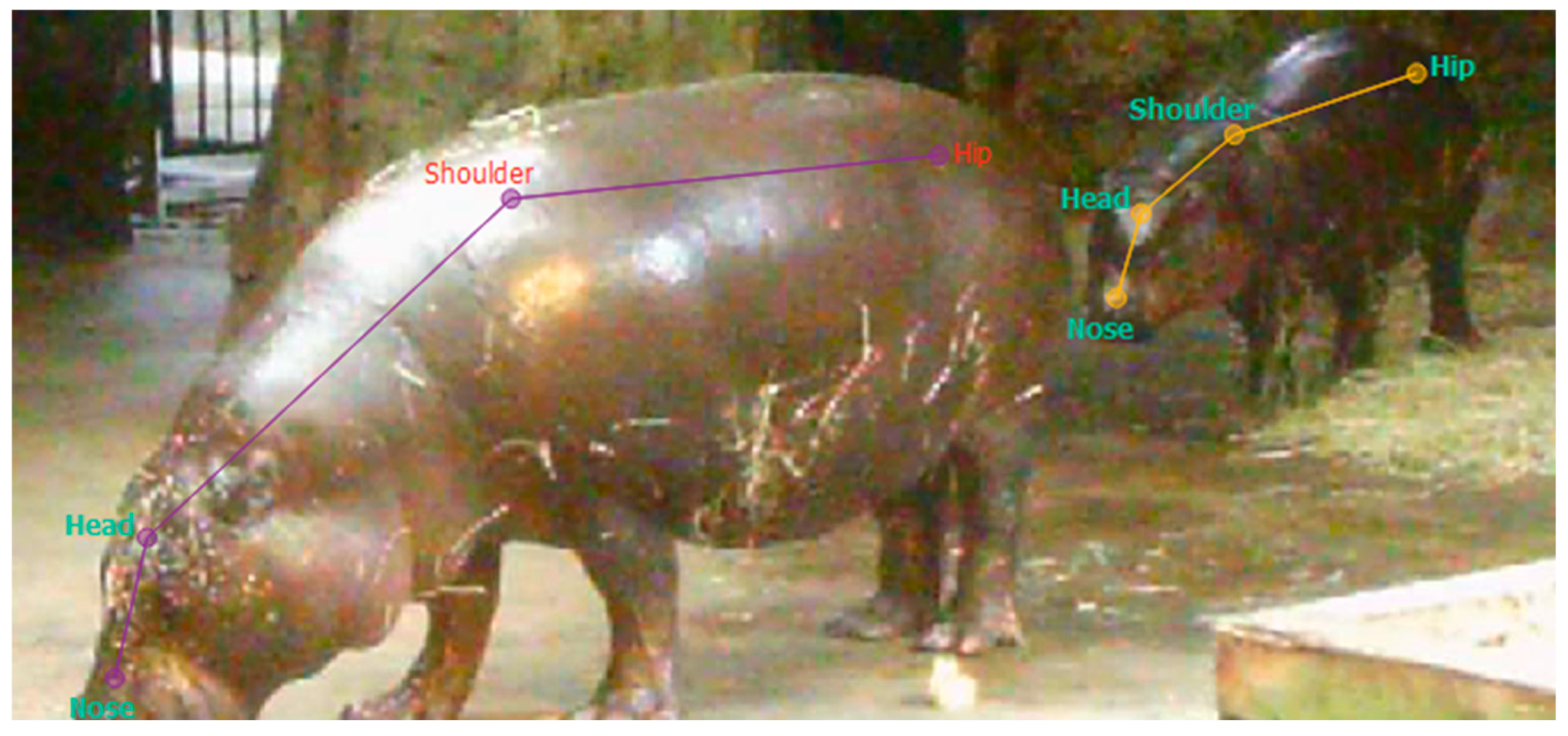 - Lund, S.M.; Nielsen, J.; Gammelgård, F.; Nielsen, M.G.; Jensen, T.H.; Pertoldi, C. Behavioral Coding of Captive African Elephants (Loxodonta Africana): Utilizing DeepLabCut and Create ML for Nocturnal Activity Tracking. Animals 2024, 14, 2820. [Google Scholar] [CrossRef]