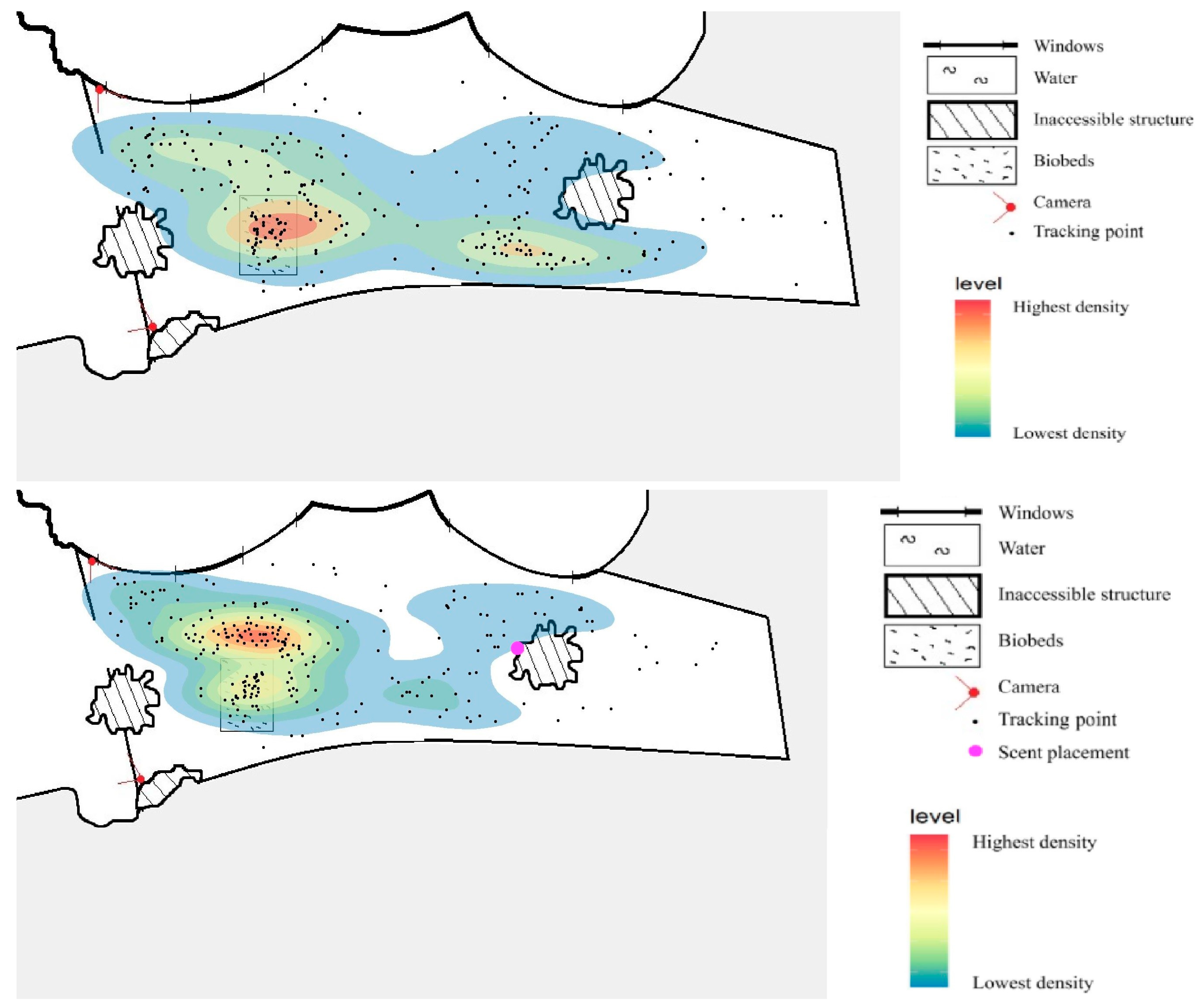 - Lund, S.M.; Gammelgård, F.; Nielsen, J.; Larsen, L.L.N.; Christensen, N.; Hansen, S.P.; Kristensen, T.; Høyer Ørneborg Rodkjær, H.; Sivagnanasundram, S.M.; Thomsen, B.Ø.; et al. Comparing Manual and Automated Spatial Tracking of Captive Spider Monkeys Using Heatmaps. Animals 2025, 15, 3056. [Google Scholar] [CrossRef]