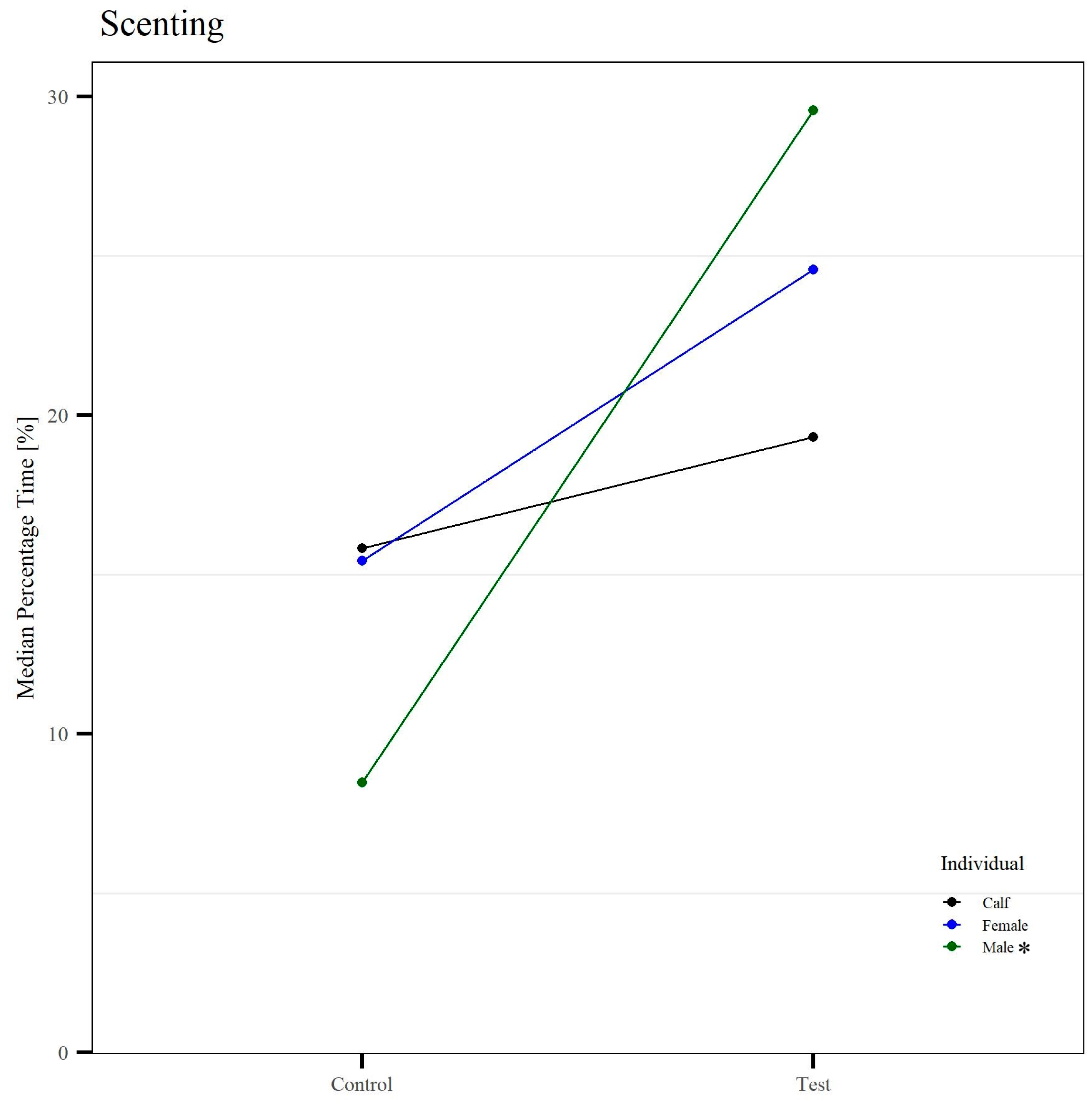 | Scenting | W = 6.0 p < 0.01 | W = 26.0 NS | W = 20.0 NS |