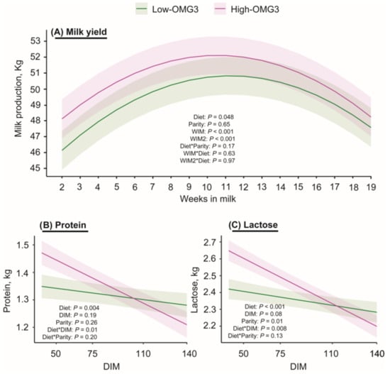 Table 3 and Figure 3B,C display the results for milk composition. Significant main effects of diet and diet-by-DIM interactions were observed for protein and lactose yields. The interaction was mainly explained by a tendency to have greater protein yield at 50 DIM and a greater lactose yield at 50 DIM in the High-OMG3 cows than in the Low-OMG3 cows. In contrast, fat yield did not differ between diets. Two cows in the Low-OMG3 and one in the High-OMG3 groups had SCCs between 200,000 and 400,000 cells/mL. Additionally, five cows in the Low-OMG3 and none in the High-OMG3 diet had SCC greater than 400,000 cells/mL. However, SCC did not differ between the Low-OMG3 and High-OMG3 diets. Finally, no main effect of parity or diet × parity interaction was detected (p ≥ 0.19) for any of the components. In contrast, the effect of DIM was significantly associated with fat, such that later DIM within the study period was associated with lower fat yield.