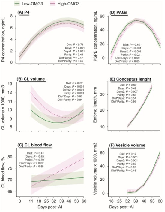 Estimated marginal means ± SEM for pregnancy-related variables from cows receiving a diet with a 6:1-LA:ALA ratio (Low-OMG3; green solid line; n = 3 pens, 18 cows) or a 2:1-LA:ALA ratio (High-OMG3; pink dashed line; n = 3 pens, 10 cows). Diets were isocaloric and isonitrogenous, fed from 11 to 60 days post-TAI. (A) Progesterone (P4), progesterone concentrations in ng/mL; (B) Corpus luteum (CL) volume in mm3; (C) CL blood flow in percentage; (D) Pregnancy-associated glycoprotein (PAG) concentrations in ng/mL; (E) Embryo length in mm; and (F) Vesicle volume in mm3. The only parameter in which diet had an effect was the CL blood flow, in which High-OMG3 cows had greater CL blood flow percentage than the Low-OMG3 cows after day 50 post-TAI. An asterisk indicates the interaction between two variables.
