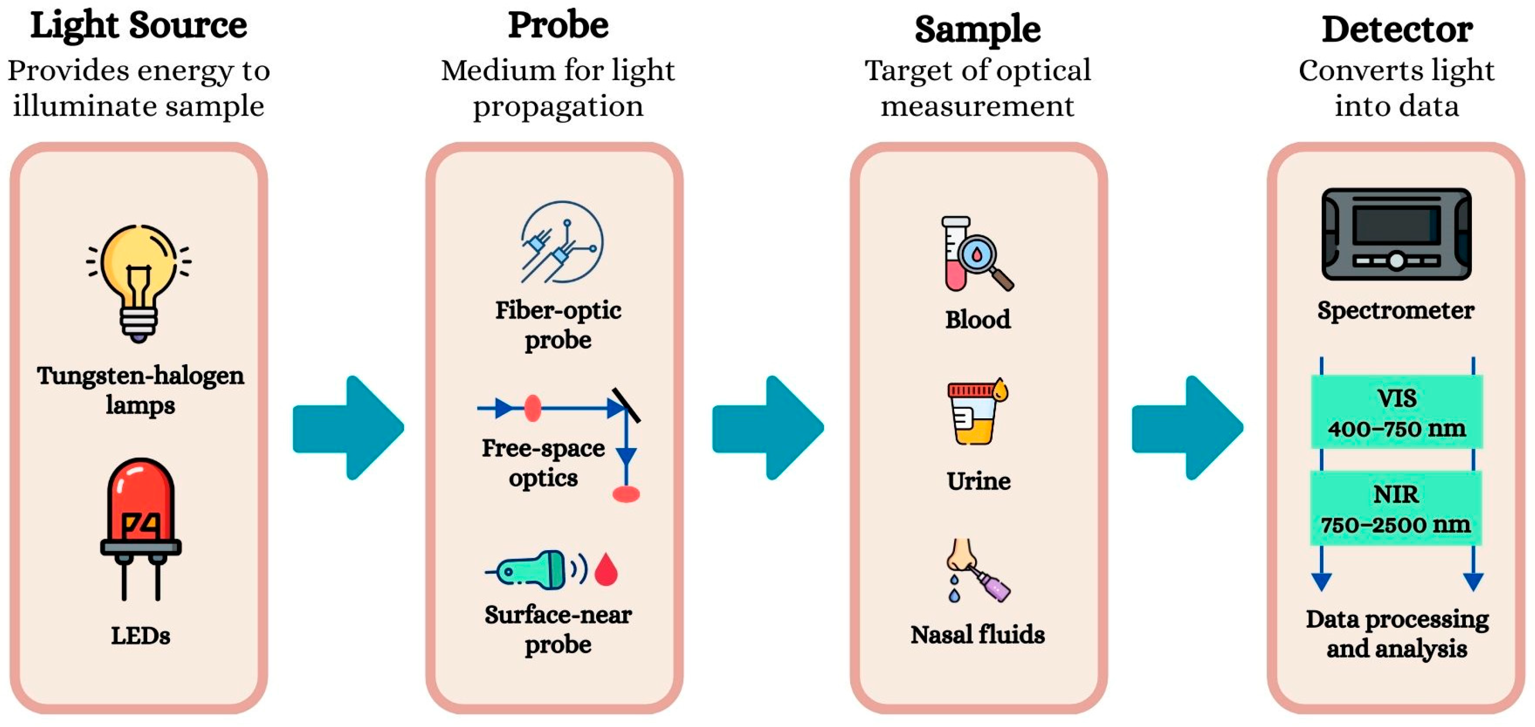 The light source plays a crucial role in the Vis-NIR spectroscopy detection system, providing the energy needed to illuminate the samples. Traditionally, tungsten-halogen lamps have been used due to their wide spectral coverage. However, they have important limitations, such as excessive heat emission and a short lifespan. For this reason, LEDs have emerged as a promising alternative, featuring higher electro-optical conversion efficiency, much longer service life, insensitivity to vibration and no risk of causing radiation burns. Despite their narrow bandwidth (30–50 nm), LEDs have been successfully integrated into portable instruments for biomedical and clinical applications. More recently, light sources based on multiple LEDs have been developed to generate adjustable spectra, facilitating the calibration and adaptability of detection systems. However, challenges remain, such as the complexity of the electronic controls and the uniform distribution of light, making it difficult to integrate them into Vis-NIR detection systems [