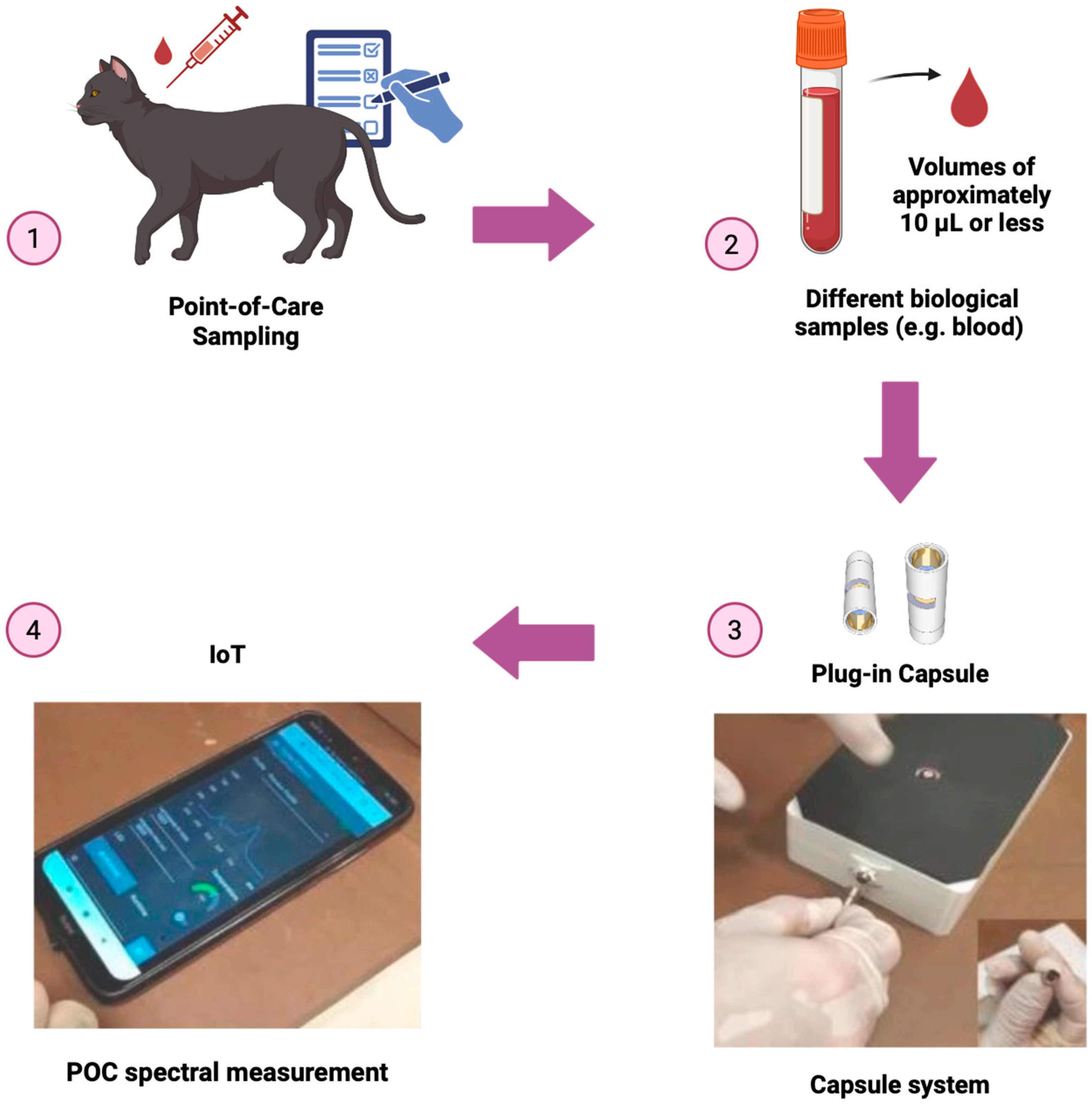 In practice, these technical principles are implemented in POC IoT platforms using miniaturized spectrometer modules, such as the Hamamatsu C12666MA (socket adapter, Hamamatsu, Japan) or USB-based systems like the Ocean Insight STS-vis. These devices manage multiple light sources, including power LEDs (4500 K) with optimized temperature and modulation. The optical setup utilizes transmittance fiber optics, where the biological sample is placed in a plug-in reusable capsule. These capsules, designed with opposing mirrors and a path length of 5 mm, allow for high-precision analysis using minimal sample volumes of approximately 10 μL or less, enabling real-time spectral registration (
