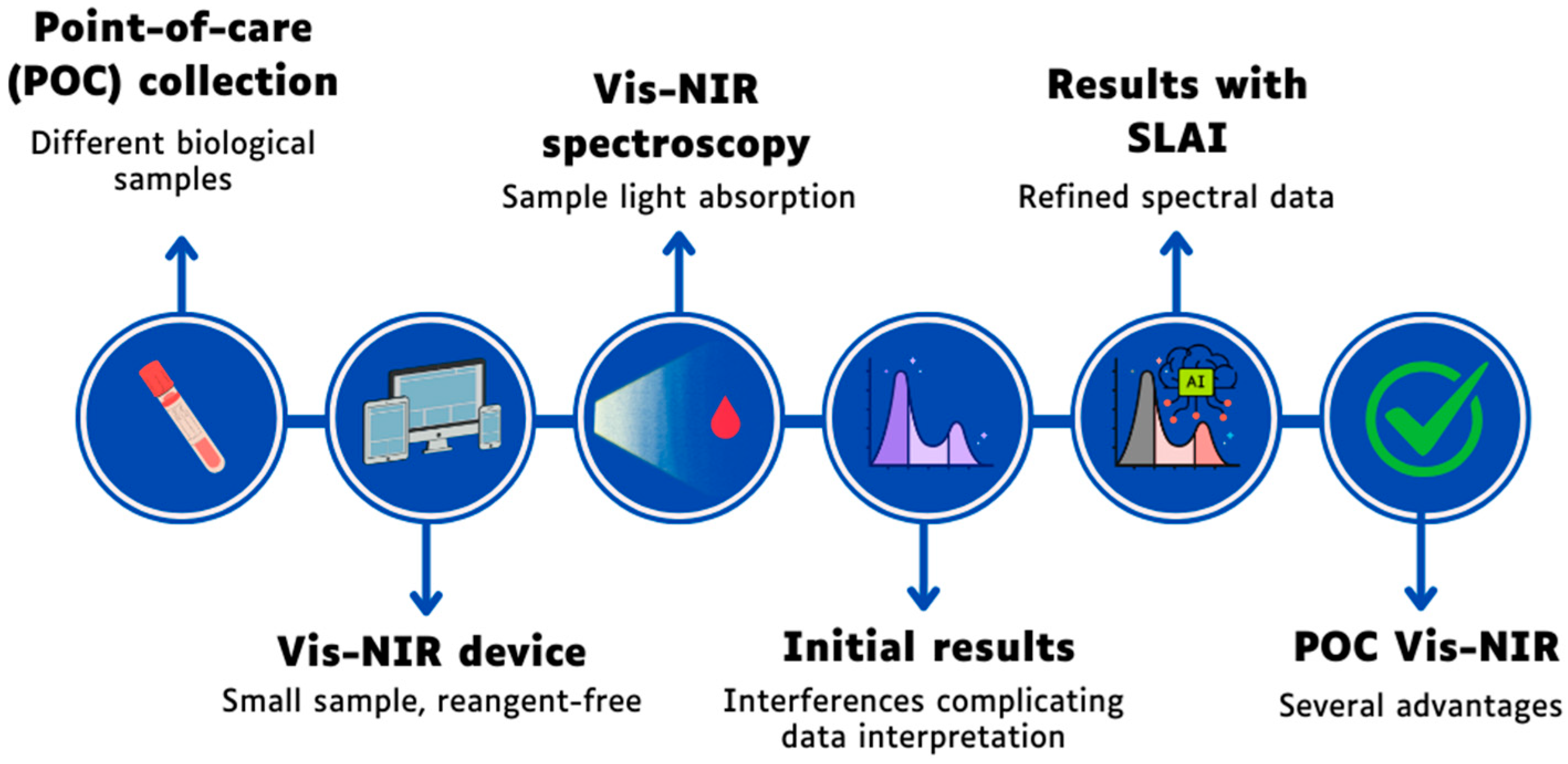 In this context, the convergence of Vis-NIR spectroscopy and POC testing represents a step forward in diagnostic innovation, combining speed and accessibility, as Vis-NIR-based POC systems have demonstrated the ability to provide real-time clinical parameters from micro-volumes of samples, with minimal preparation and high efficiency [