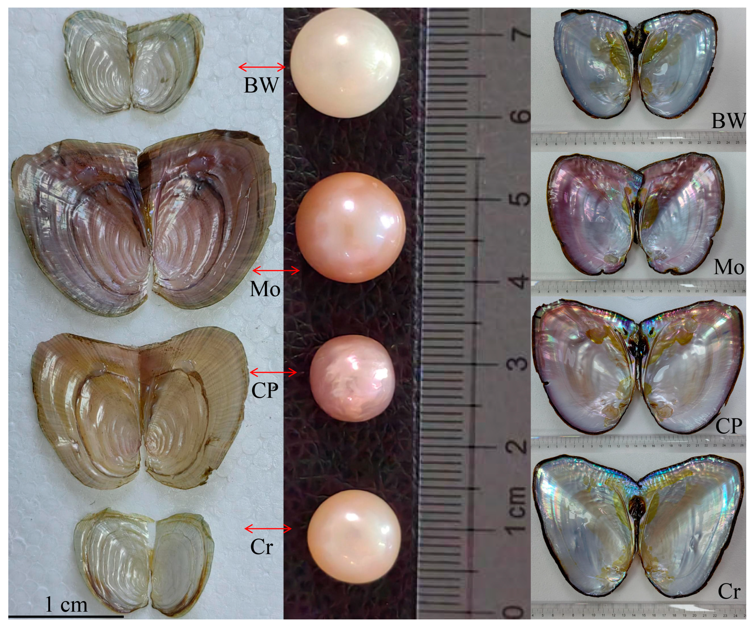 - Li, J.; Wang, D.; Bai, Z.; Guan, Y.; Wu, C.; Chen, L. Report on the Development of Freshwater Pearl Culture Industry in China, 2019th ed.; Agriculture and Rural Development Ministry’s Fisheries and Fishery Administration Bureau: Beijing, China, 2019; pp. 23–29. Available online: https://www.cnki.com.cn/Article/CJFDTotal-SJNY202003004.htm (accessed on 16 September 2025). (In Chinese)