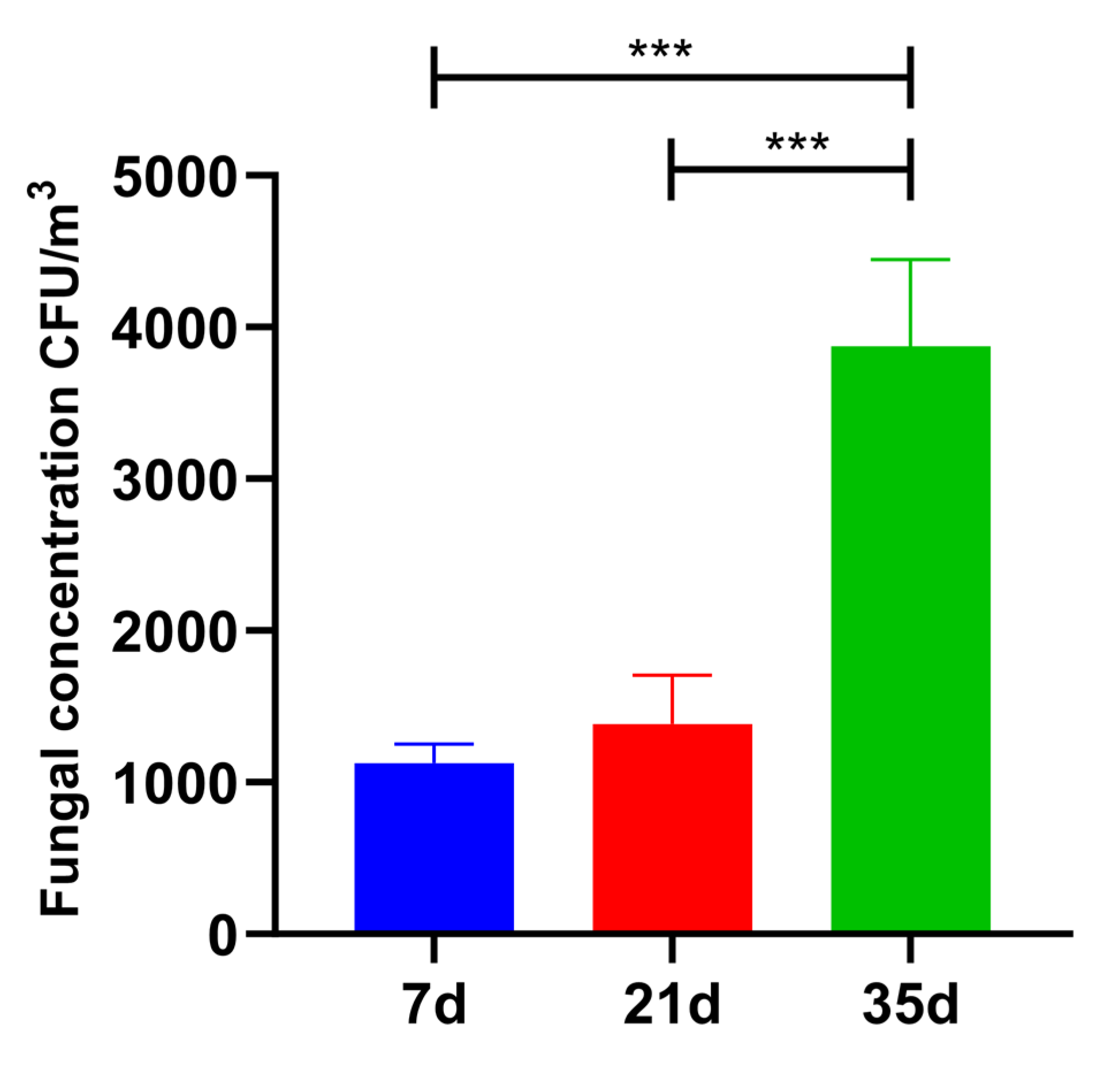 - Chen, G.; Ma, D.; Huang, Q.; Tang, W.; Wei, M.; Li, Y.; Jiang, L.; Zhu, H.; Yu, X.; Zheng, W.; et al. Aerosol concentrations and fungal communities within broiler houses in different broiler growth stages in summer. Front. Veter-Sci. 2021, 8, 775502. [Google Scholar] [CrossRef] [PubMed]
