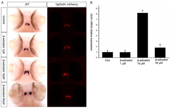 β-estradiol treatment experiments. In the treatment experiments, each treatment group contains 30 embryos (3 parallel). All samples were treated from 48 hpf to 96 hpf. At 96 hpf, in situ hybridization, qPCR, and fluorescence signals were detected. (A) In situ hybridization to detect GnIH mRNA changes of wild-type zebrafish embryos treated with different doses of β-estradiol (1 μM, 10 μM, 50 μM). This treatment experiment was also repeated using transgenic zebrafish embryos. (B) In the wild-type zebrafish embryo treatment experiments, qPCR was also preformed to confirm the results. The results are presented as mean ± SEM values. Values accompanied by different letters are significantly different (ANOVA followed by Tukey’s test, p < 0.05).