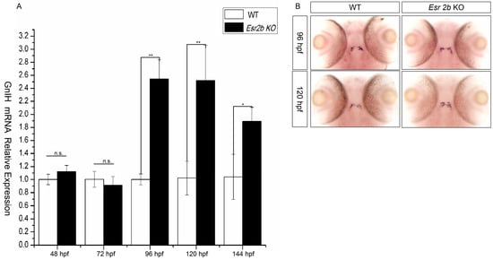 The difference in GnIH mRNA expression between wild-type and esr2b knockout zebrafish at different developmental stages. (A) qPCR was also performed to detect the difference in GnIH mRNA expression level from 48 hpf to 144 hpf. (* represents a significant difference, p < 0.05; ** represents a significant difference, p < 0.01). (B) In situ hybridization to detect between wild-type and esr2b knockout zebrafish embryos at 96 hpf and 120 hpf. At different developing points, 30 embryos of wild-type and esr2b knockout zebrafish were sampled for in situ hybridization and qPCR detection.