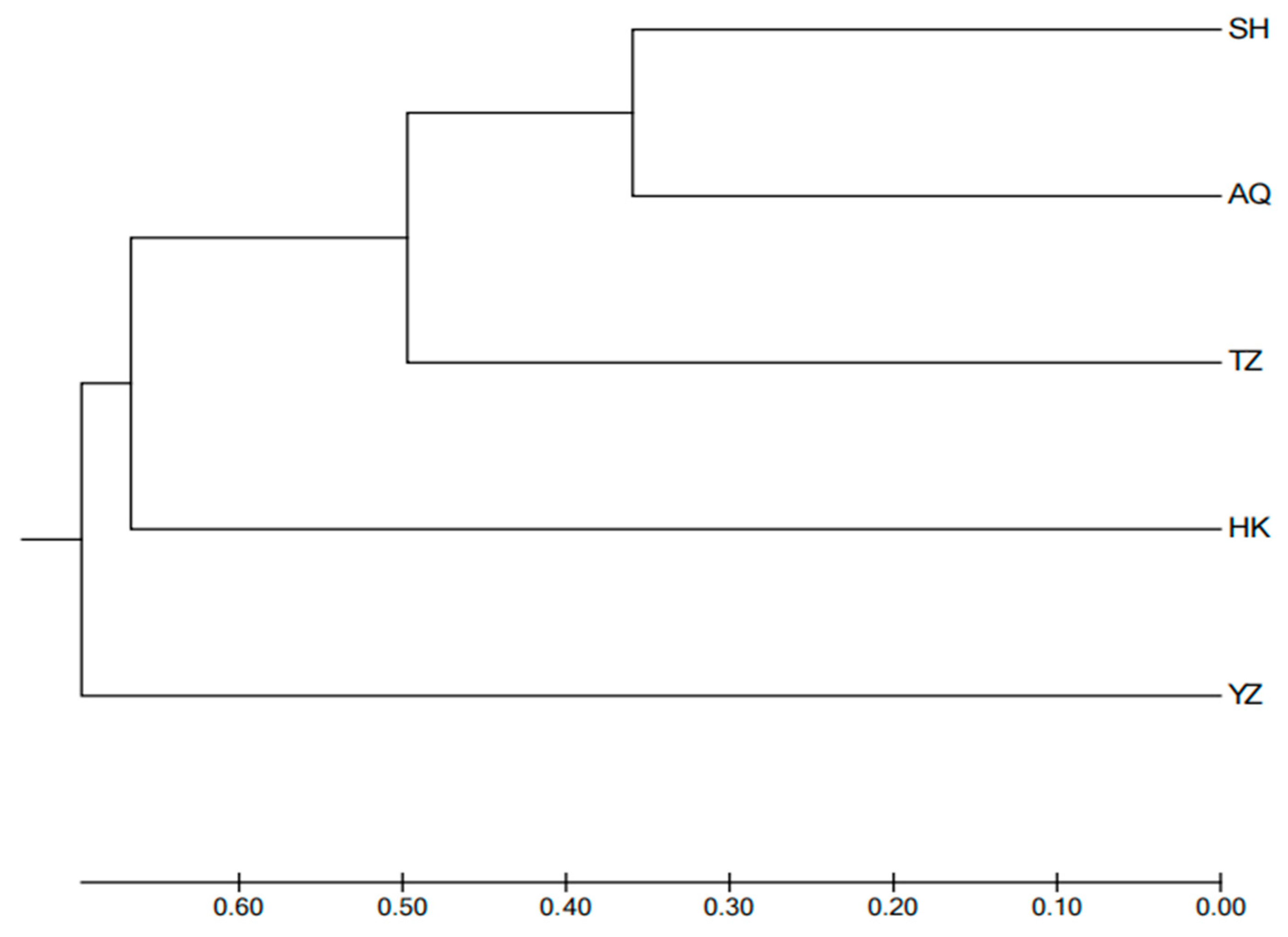 24]. In this study, genetic distances between populations ranged from 0.719 to 1.898, with similarity coefficients varying between 0.150 and 0.487. The SH and AQ populations were the most genetically similar, with the smallest genetic distance (0.719) and highest similarity coefficient (0.487). In contrast, the YZ population had larger genetic distances from other populations (1.056 to 1.898) and lower similarity coefficients (0.150 to 0.348), reflecting its distinctness from the other populations. This could also be due to other groups being wild populations. According to the UPGMA clustering tree based on Nei’s genetic distance, the SH group clustered first with the AQ group, then with the TZ group, followed by the HK group, and finally the YZ group. Similarly, the PCoA results showed that the SH and AQ groups clustered together, while the YZ group was distinct.