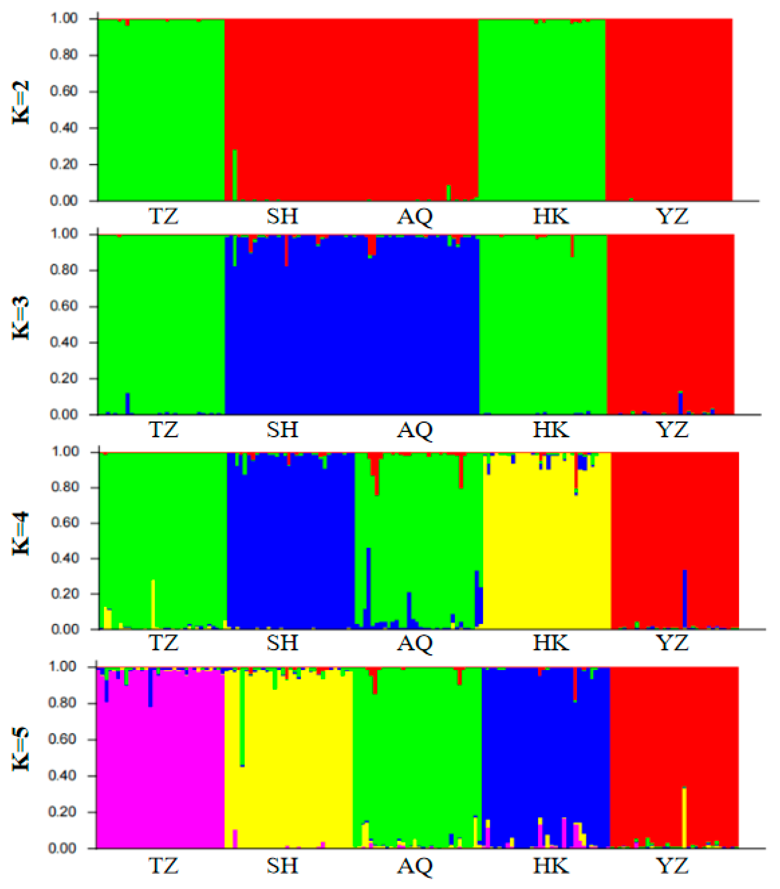 FST values between the HK population with the SH, AQ and YZ populations were all greater than 0.05, which demonstrated a moderate degree of genetic differentiation between the Hukou population and the aforementioned populations (