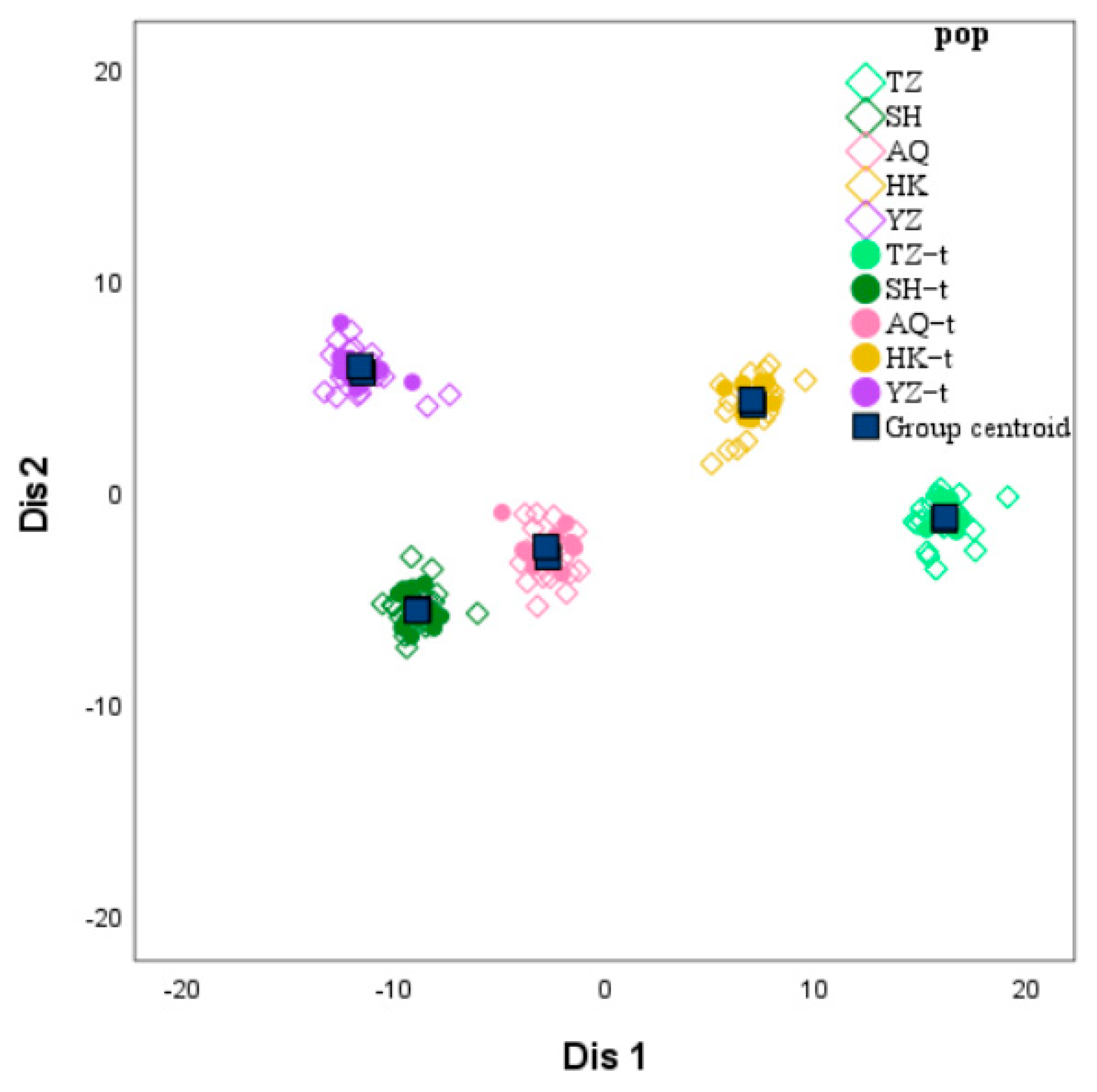 Figure 5, individuals from SH and AQ exhibit some degree of overlap, whereas populations TZ and HK are closely clustered. The YZ population is clearly separated from the other four populations, with no observed individual-level admixture. The inclusion of DAPC strengthens the inference of genetic clustering and validates that the division of