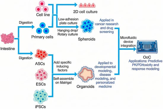 ASCs were the earliest cell type used for culturing organoids, typically isolated from specific tissues such as the intestine, mammary gland, and hair follicle [28,29,30]. These stem cells are tissue-specific. Under culture conditions that add specific growth factors (e.g., EGF, Noggin, R-spondin) and inhibit differentiation signals, they can self-renew and differentiate into multiple cell types found in the tissue of origin, thereby forming the corresponding organoids. For example, cells isolated from the intestinal crypts of dogs or cats can be used to cultivate intestinal organoids with crypt-villus structures [28,31]. ASC-derived organoids have a stable genetic background and can retain individual and tissue characteristics, making them very suitable for disease modeling, drug screening, and personalized medicine research [27,32].