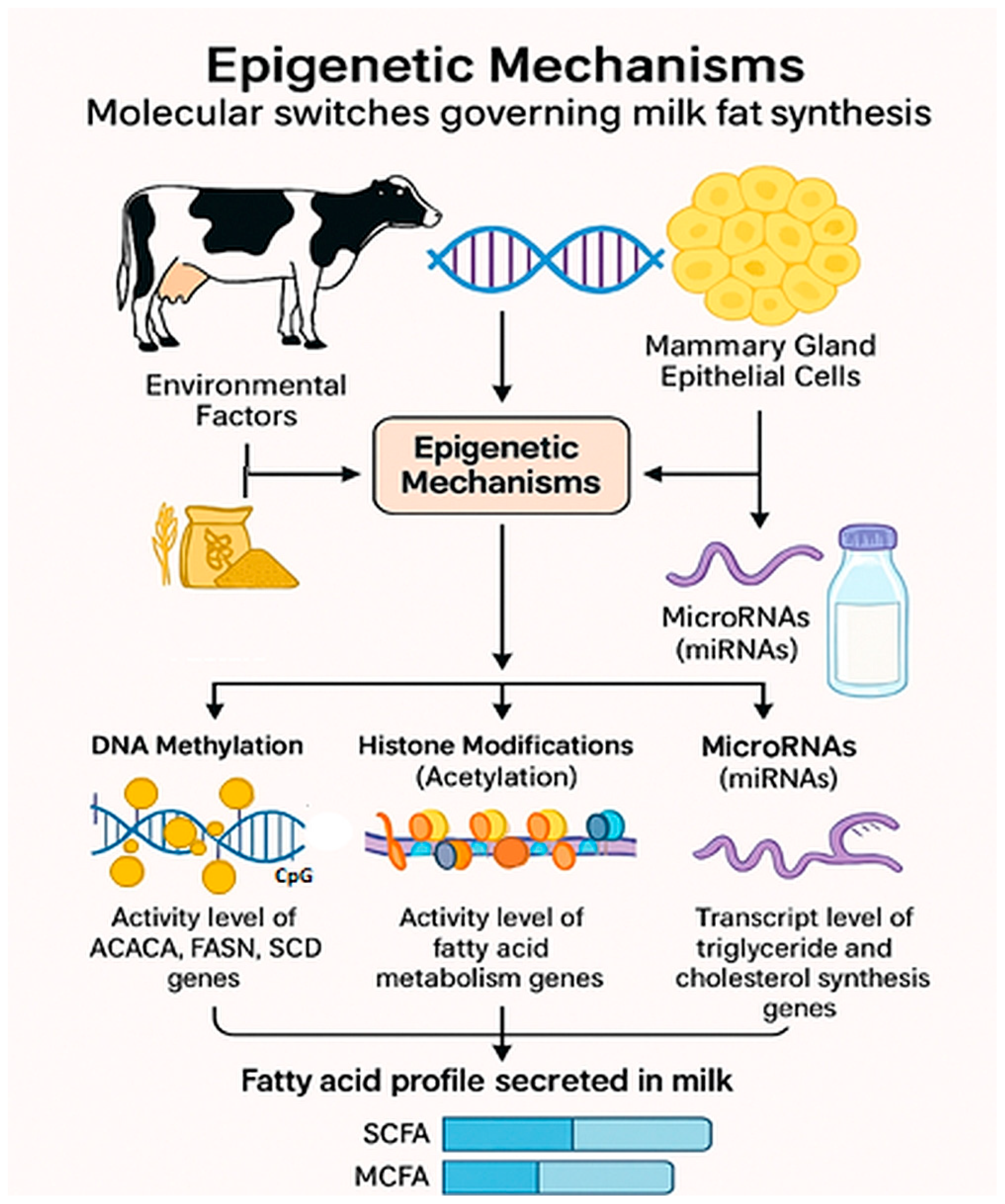 | Epigenetic influence on milk FA composition | 6/138 | Epigenetic mechanisms (DNA methylation, histone modifications, and miRNAs) serve as molecular switches, providing the link between a dairy animal’s metabolic state and diet and the actual FA profile secreted into the milk. These nutrient-responsive processes regulate the accessibility and expression of key lipogenic genes (e.g., acetyl-CoA carboxylase, FASN, SCD), where modifications can either suppress de novo FA synthesis (e.g., via methylation) or activate it (e.g., via ω−3-promoted histone acetylation) to influence the final composition of milk fats [65,77,78,79,80,81]. |