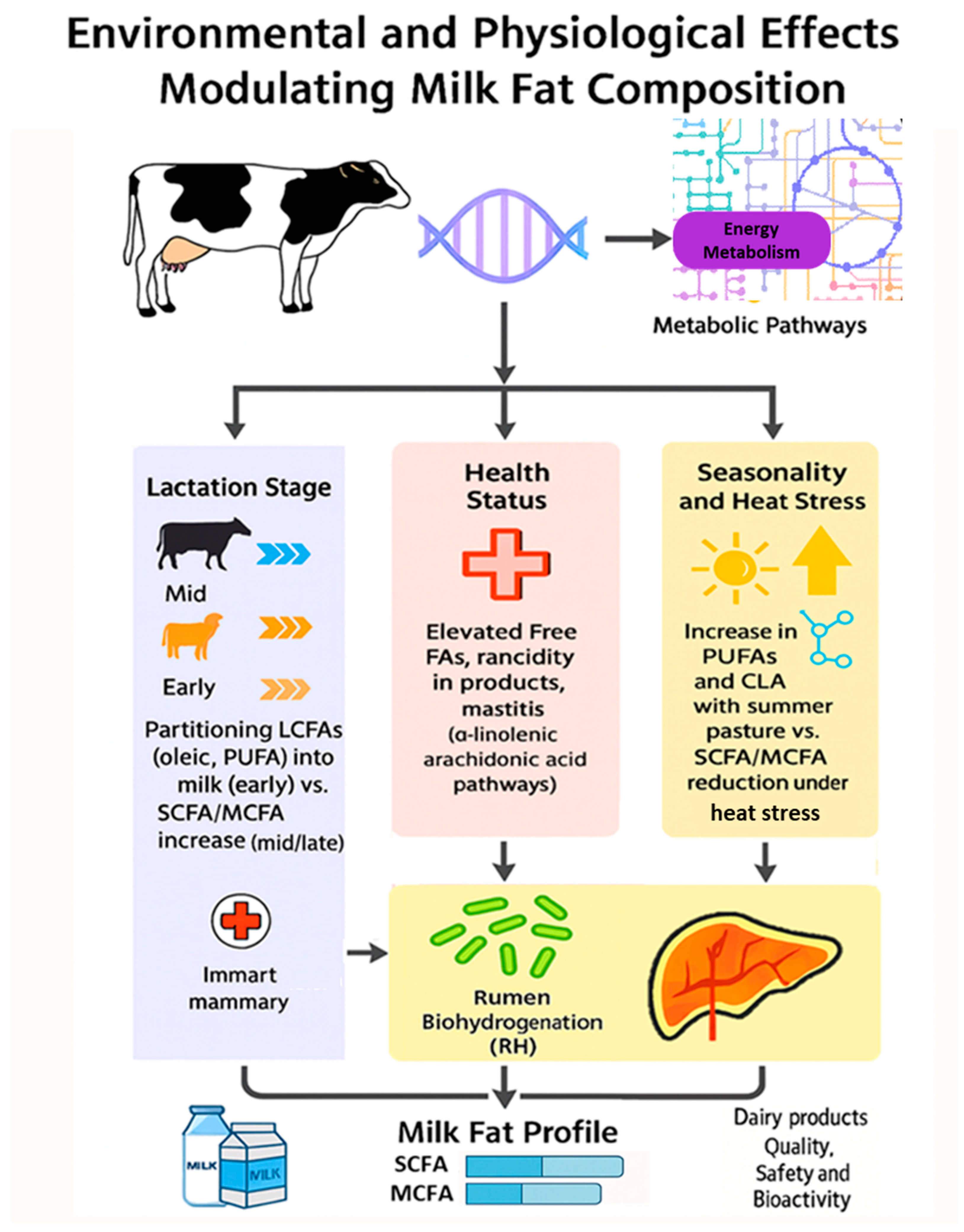 | Environmental and welfare factors influencing milk lipids | 21/138 | The animal’s physiological status and stage of lactation are essential modulators of milk FA composition. Early lactation, marked by body fat mobilization, shifts the profile toward decreased de novo FAs and increased long-chain FAs, whereas late lactation often shows an increase in saturated FAs. Metabolic health issues like ketosis and overall energy balance also substantially affect milk fat synthesis. Separately, environmental conditions, animal welfare, and management practices indirectly influence lipid profiles. Factors like seasonal variations and housing systems alter feed quality, animal health, and stress levels. The synergy of these physiological and environmental changes affects milk yield, metabolic stability, and the final nutritional/functional value of the milk, impacting the sustainability of dairy production [1,2,18,24,26,27,74,82,88,89,90]. |