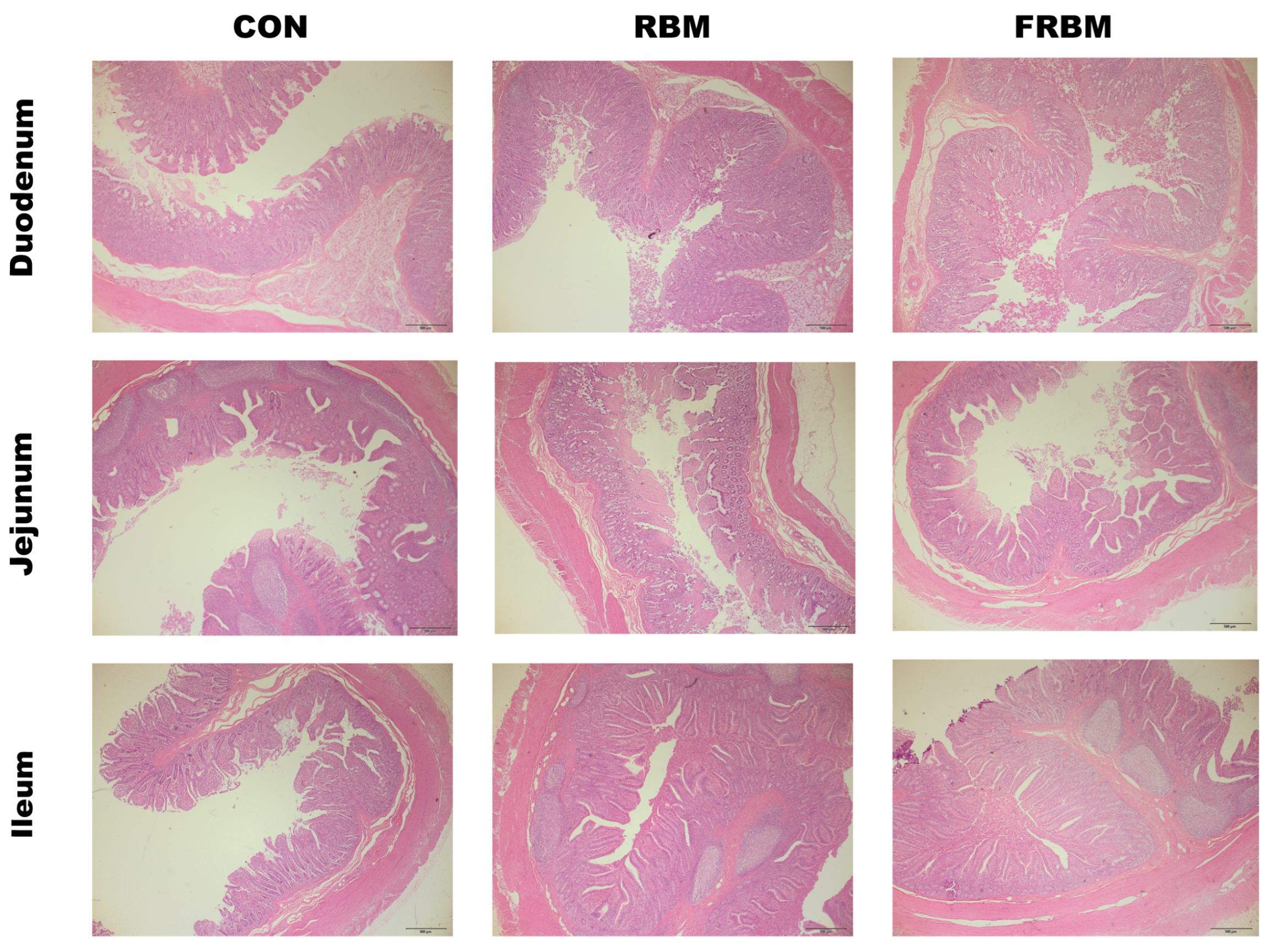 40]. At the same time, the activity of digestive enzymes secreted by the small intestine affects nutrient digestion efficiency, thereby influencing overall metabolic processes. The RBM group revealed no notable differences from the CON group in any measured parameters of the jejunum and ileum, including villus morphology and digestive enzyme activity. In comparison to the CON group, the FRBM group demonstrated a notable enhancement in ileal villus height and a trend toward an increase in the jejunum, though the villus-to-crypt ratio remained unchanged. Previous research under the same bacterial-enzyme synergistic treatment used here reported that FRBM contains significantly higher levels of total phenolics and flavonoids than unfermented RBM [