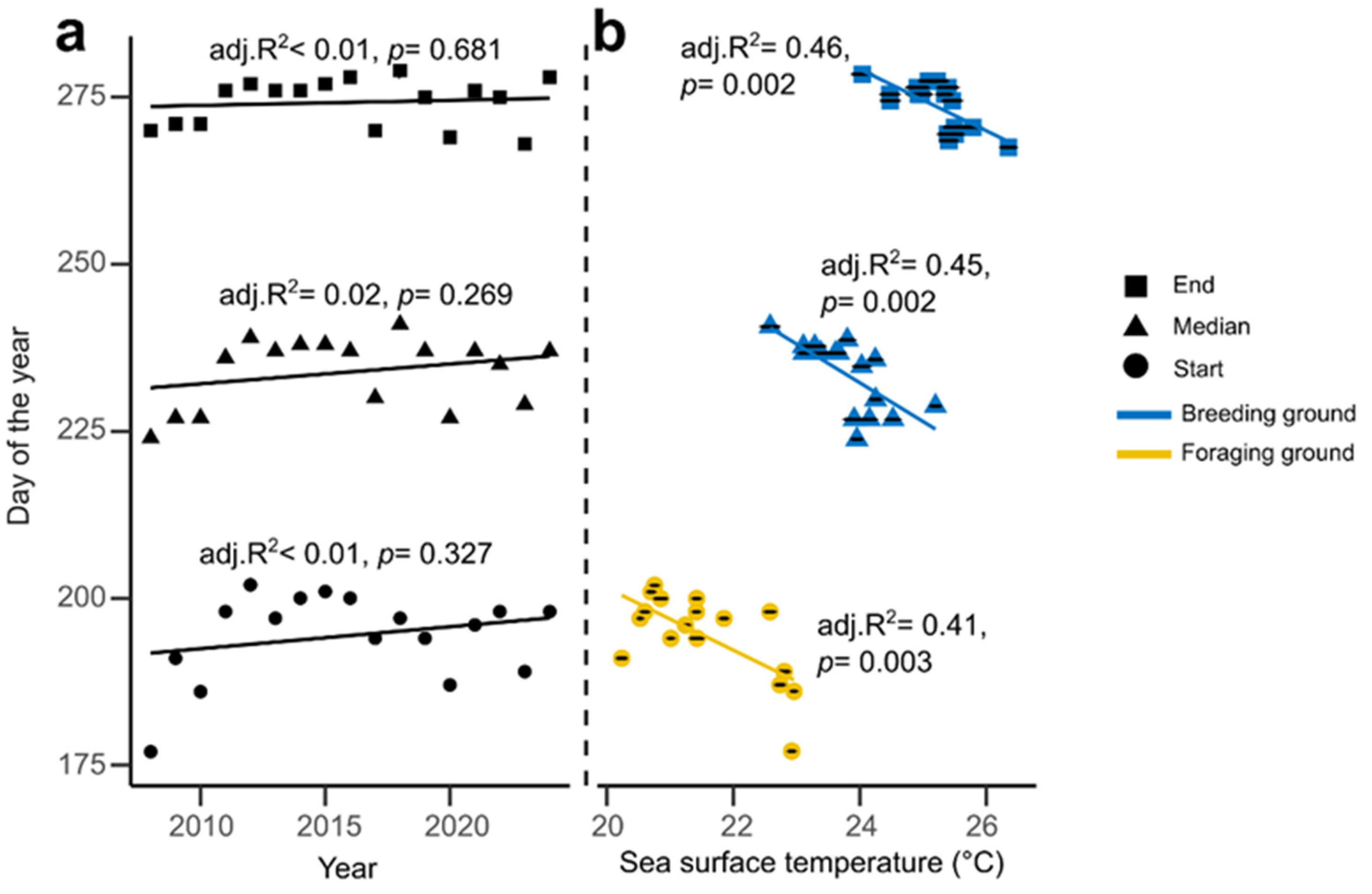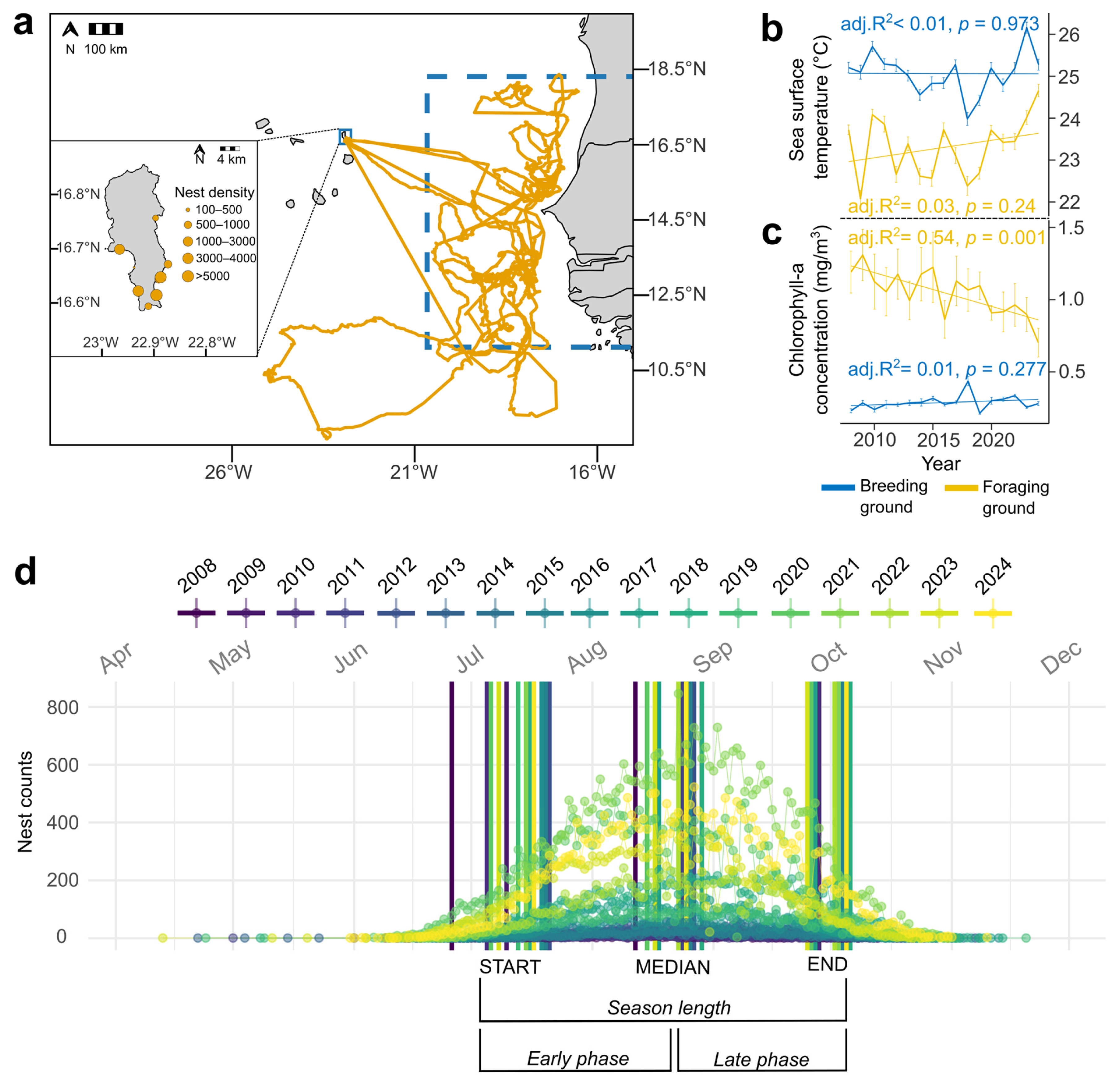 - Nesting phenology: The start of nesting correlates with SST at the foraging grounds during March–April and/or at the breeding ground during May–June. Median nesting dates may correlate with SST at the breeding ground during June–August, and season end with SST at the breeding ground during September–October.